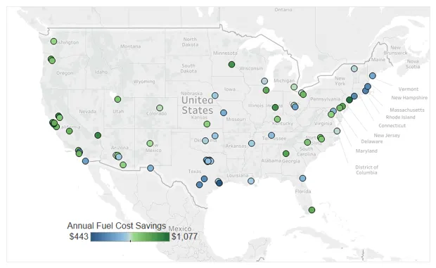 “大多数人知道汽油的价格——如果你开车,你会经过加油站,看到价格——但很多人并没有考虑电力的定价,”报告的作者大卫·赖希穆斯说。根据美国50个最大城市的电动车加油价格数据,他发现电动车用户每年可以节省近800美元,具体取决于他们在哪里、何时以及如何给车充电。