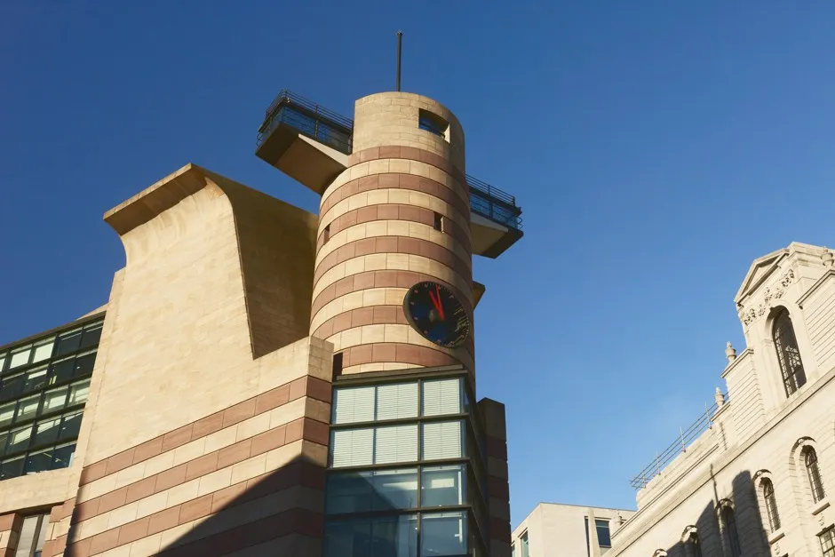 位于第一家家禽公司内部。综合项目这真是一个纪念碑。斯特林的建筑呈船形,轮廓扭动不安。它有一点古埃及风格,有一点墨索里尼的影子,给人一种轻浮而沉重的感觉,前面是一座巨大的塔楼,其突出的平台让它看起来像是一个对耸肩表情符号的石砌纪念碑。它的屋顶花园通过一家餐厅进入,是一个你可以轻易想象某个戈登·盖克-邦德反派混合体在其修剪整齐的植物中踱步,喂养敌人的内脏给宠物孔雀的地方。