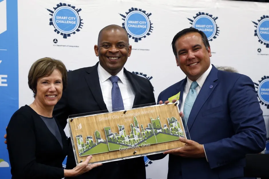 巴布·贝内特,左,火山公司总裁/首席运营官,和前美国交通部长安东尼·福克斯,中心,在2016年向哥伦布市市长安德鲁·金瑟颁发智能城市挑战奖。杰伊·拉普雷特/火山公司提供的美联社图片。俄亥俄州的哥伦布市是美国婴儿在一岁生日之前死亡率最高的城市之一。但许多人并不知道这个婴儿死亡危机的存在;随着年轻、受过良好教育的居民不断增加,这座中西部城市以宜居著称,并且在全国排名中表现良好最佳居住地。