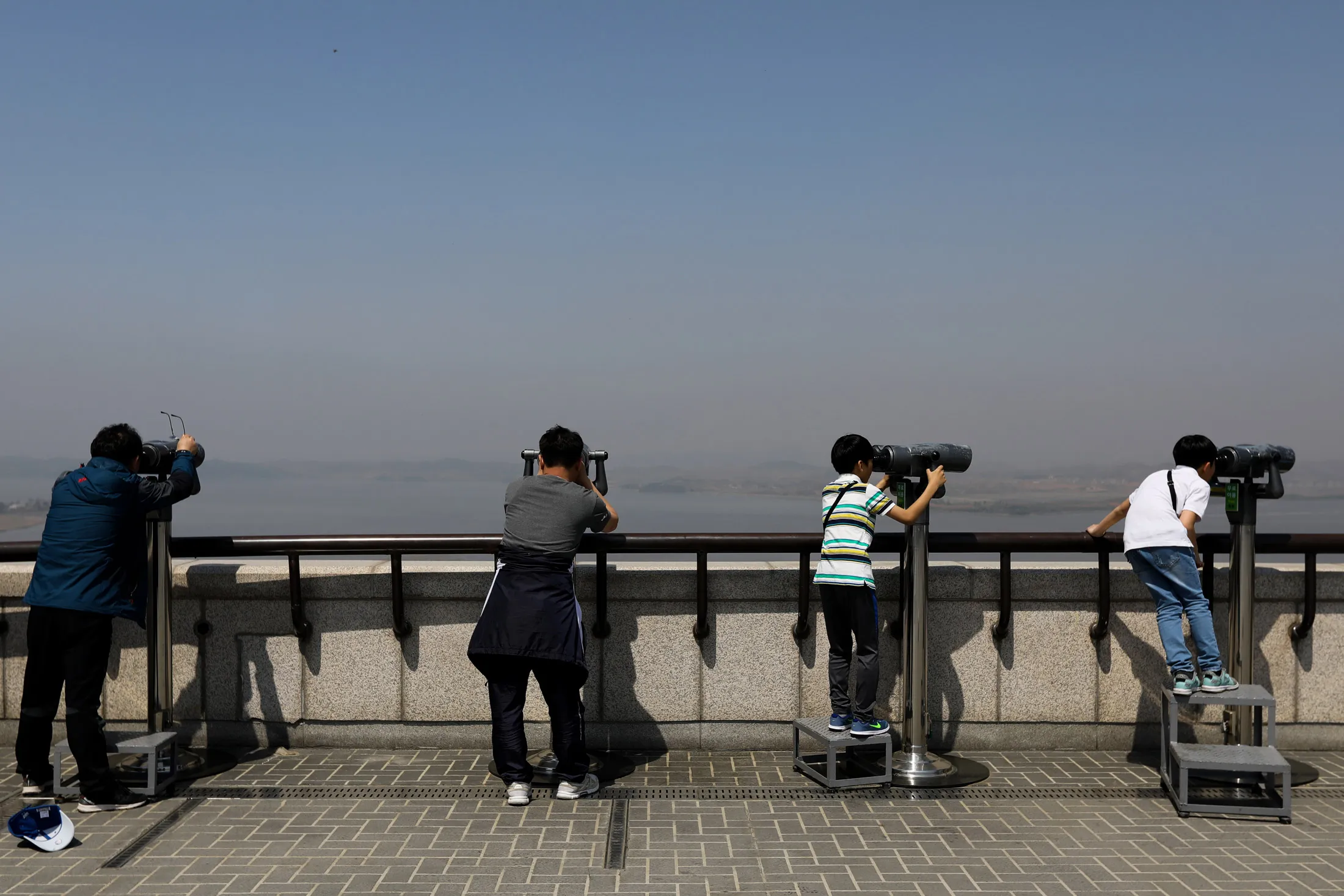 游客在韩国坡州的非军事区附近的天文台通过望远镜观察朝鲜。