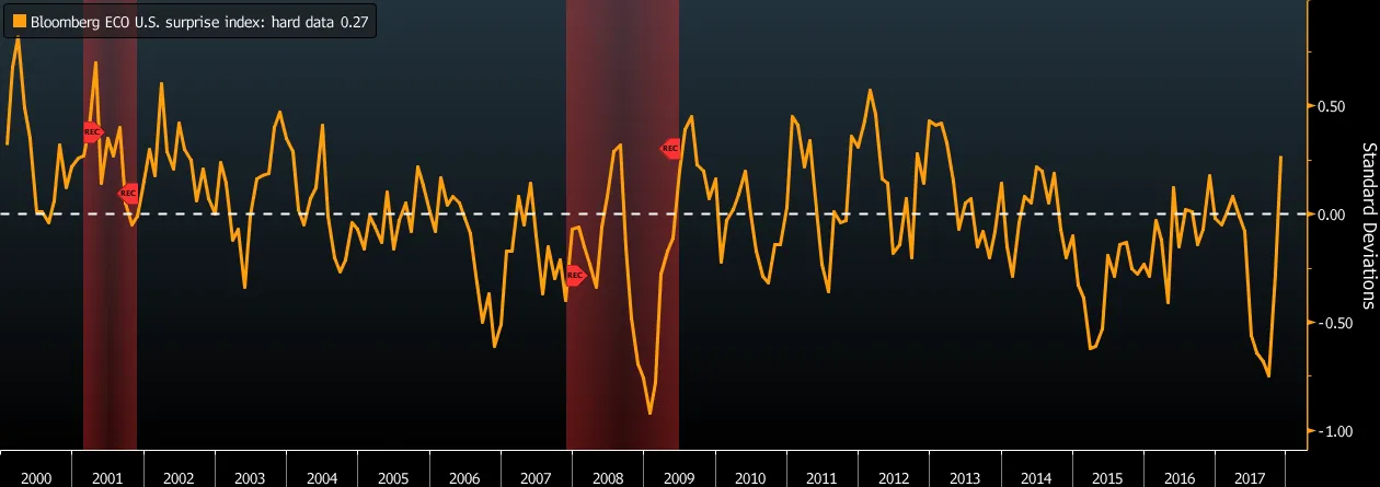 全球股市在周一有小幅上涨,MSCI全球所有国家指数接近历史高点,预计今年将实现超过20%的罕见涨幅。自然,关于股票是否被高估以及是否会回调的辩论正在加剧,或者只是反映了经济的潜在强劲。无论你站在哪一方,凭借跟踪实际经济产出的所谓硬数据,很难否认基本面对多头来说看起来非常好。彭博社的美国意外指数跟踪经济数据相对于经济学家预测的表现,在2013年3月以来的11月达到了最高点,根据彭博新闻的马修·博斯勒的报道。该指标几乎包括所有主要报告,除了商业或消费者信心的调查。“当然,股票倍数在绝对值上看起来并不便宜,”摩根大通的股票策略师在一份研究报告中写道。“但相对于债券和信贷,我们发现股票仍然提供近300个基点的估值差距,而这仅仅是达到公允价值。”