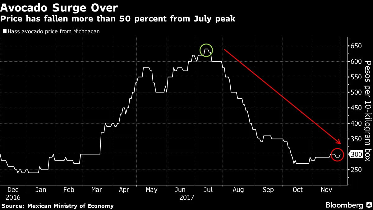 潮人获得喘息机会还记得年中关于鳄梨价格大幅上涨的故事吗?人们将其归咎于潮人及其对鳄梨吐司的热爱?好吧,千禧一代现在可以稍微松一口气,因为鳄梨价格已经大幅下滑。美国农业部在上周的更新中表示,良好的天气和更好的害虫控制预计将提升墨西哥哈斯鳄梨的产量,该年度始于七月。批发价格已经从今年夏季创下的纪录中下降,较大的作物应该能防止成本再次达到那些峰值,彭博新闻的梅根·杜里辛表示。美国人吃了很多鳄梨——根据九家鳄梨公司发给美国贸易代表的一封信,去年人均超过7磅。这与1996年相比,当时每人仅为一磅,那是墨西哥获得进入美国市场的前一年,彭博新闻的迪娜·香克尔表示。这可能只是暂时的喘息机会,具体取决于特朗普政府在重新谈判北美自由贸易协定时是否会改变反倾销和补贴税的规则。这些税旨在保护美国生产商免受以低于生产成本的价格在美国销售商品的外国竞争者的影响,有时还会得到其本国政府的补贴。