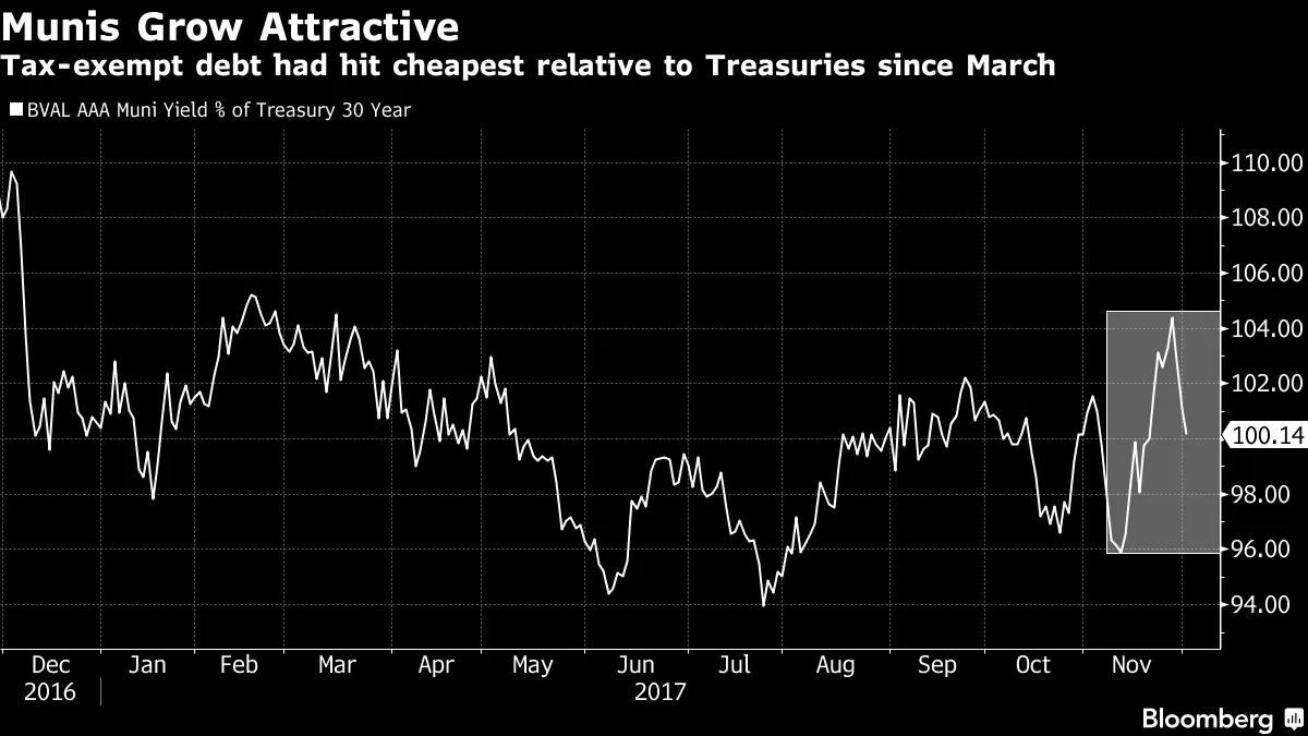 市政债券洪水市政债券投资者正在为2017年乃至未来几年可能出现的最大一周做好准备。根据彭博新闻的乔·米萨克的估计,本周美国借款人可能会出售190亿到210亿美元的免税债券,几乎是今年平均水平的三倍,他认为这个金额在所有事情结束之前可能会更高。发行量激增的原因是参议院在这个周末通过了其税改版本,其中包括禁止免税提前再融资。下一步是众议院和参议院解决两个版本之间的差异。在那里,任何事情都有可能发生。众议院希望禁止免税体育场融资、税收抵免债券、提前再融资和私人活动债券。也许参议院的版本会占上风。也许有人会要求体育场融资真的必须取消,只有某些类型的私人活动债券应该被允许,但正如米萨克所指出的,没有办法知道。市政债券价格在最近几周一直在下滑,上周一度使证券相对于美国国债处于自三月以来的最低点。在周五的反弹之前,30年期免税债务的收益率已跃升至约103%的国债。