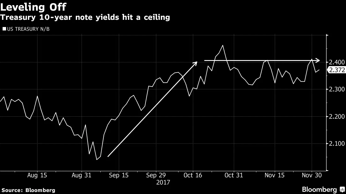 国际清算银行,通常被称为中央银行的中央银行,发布了一份报告称,股票看起来“泡沫”,特别是在美国。股票价格高于历史平均水平,美国公司可能会面临继续其股息增长速度的困难,国际清算银行在周日的季度回顾中表示。“最终,几乎所有资产类别的命运似乎都取决于政府债券收益率的演变,”这家位于瑞士巴塞尔的机构表示。“关于这些收益率在核心地区货币政策正常化后将达到的水平也存在重大不确定性。”债券交易员保持谨慎如果经济前景如此强劲,那么如何解释长期债券收益率?尽管周一有所上升,但它们仍然相对低迷,10年期国债收益率难以突破2.40%。回想一下,在年初,彭博新闻调查的经济学家和策略师的中位数预估是,到现在收益率将接近2.75%,甚至可能在美联储加息并开始缩减资产负债表时达到3%。债券交易员自然更加谨慎,似乎在根据预测采取行动,认为包括共和党支持的减税在内的财政刺激将在未来两年内仅对美国经济提供适度的推动,许多经济学家也预计在此期间将开始衰退,根据一项新的调查。彭博新闻的安德鲁·梅耶达报道,大约一半的经济学家表示,财政政策变化将在2018年将美国增长提高0.2到0.39个百分点,根据全国商业经济学会在11月6日至15日进行的51位预测者的调查。大约五分之一预计会有更大的增长,另有五分之一认为对增长没有好处。“虽然税收改革可能被视为共和党立法者的巨大政治胜利,但每年1400亿美元的刺激几乎不会对19.5万亿美元的美国经济产生影响,”BMO资本市场的利率策略师在一份研究报告中写道。