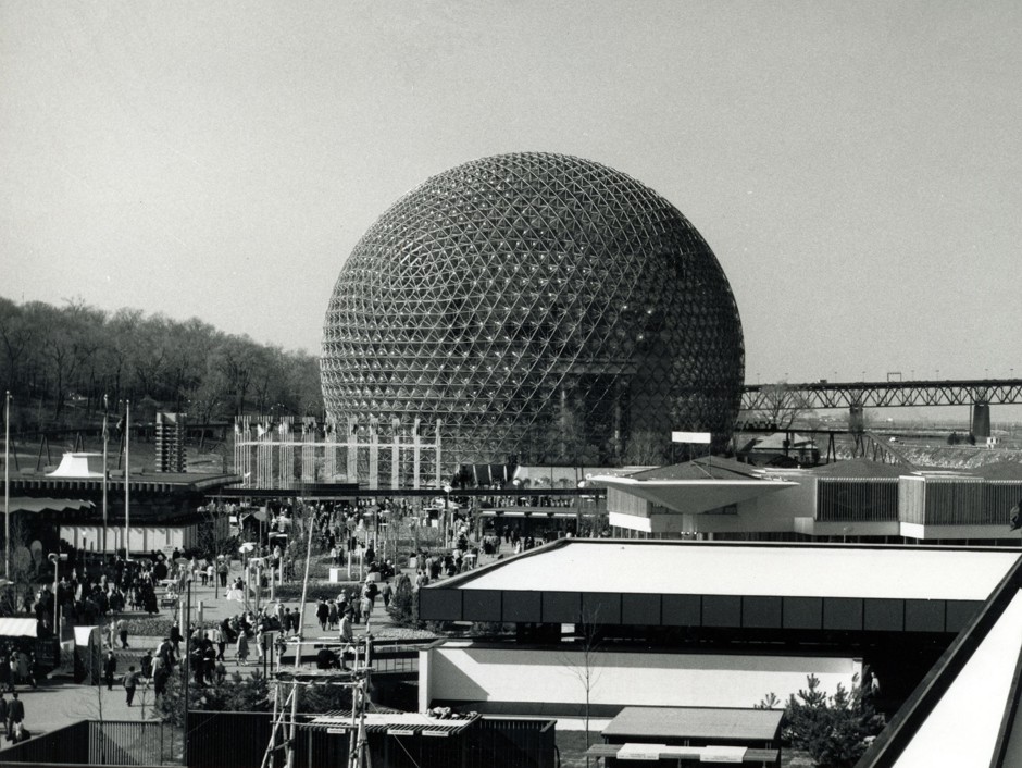 巴克敏斯特·富勒的生物圈在蒙特利尔1967年世博会上的样子。加拿大建筑档案馆,卡尔加里大学在世界各地,如果你谈论的是穹顶结构,你就是在谈论巴克敏斯特·富勒。但在魁北克,这个话题也应该包括杰弗里·林赛。