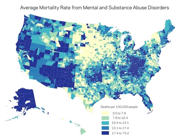 EIG许多其他负面健康结果,从肥胖和糖尿病到死亡率和物质滥用,随着社区经济状况的恶化而变得更加普遍和威胁。困扰县的死亡率比繁荣县高出25%以上,精神和物质滥用障碍导致的死亡率高出64%。在一些特别荒凉的地区,这些“绝望之病”的死亡率——包括自杀、酗酒和药物过量——达到全国平均水平的四倍以上。阿巴拉契亚最偏远的角落和西部最孤立的美洲原住民保留地受到的影响最严重。这种基于地点的心理和身体健康差异再次证明了美国繁荣社区与在21世纪经济演变中被遗弃的社区之间日益扩大的鸿沟。