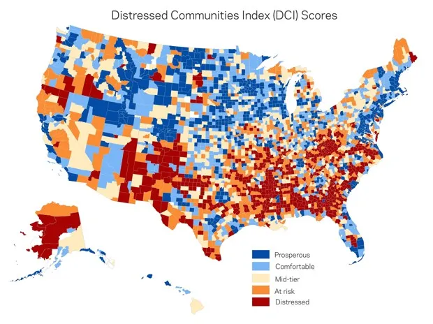 我们的组织,经济创新集团(EIG),致力于揭示分隔美国社区的社会经济断层线。我们最近将EIG的困扰社区指数(DCI)的县级经济福祉指标与疾病控制与预防中心(CDC)的数据进行了交叉分析,发现困扰县的药物死亡率平均比富裕地区高出37%,而阿片类药物处方率几乎高出56%。