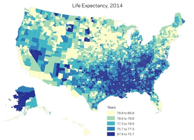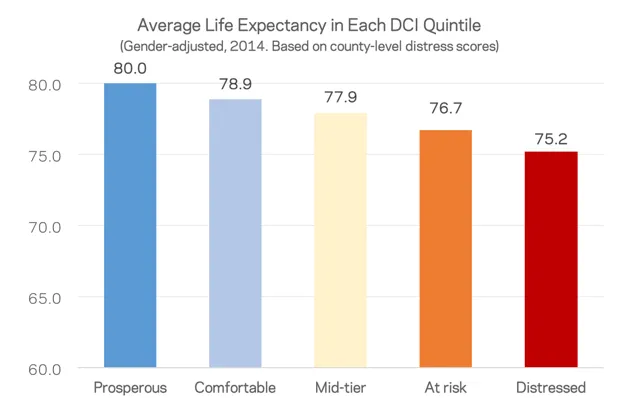 EIG例如,地点与预期寿命之间的联系是显而易见的。居住在繁荣县的人们——在DCI评分中表现最佳的五分之一的县——平均比经济困扰的邻居多活五年。经济困扰地区的平均预期寿命为75.2年,几乎比美国平均的79.1年低四年。