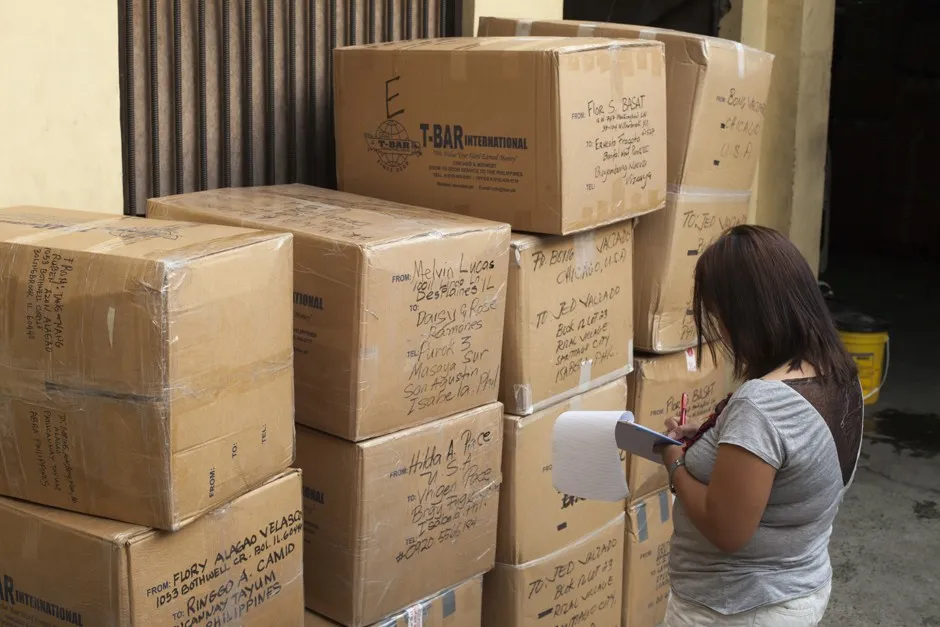 T-Bar International的一名员工在奎松市的仓库中清点balikbayan盒子。杰森·雷布兰多