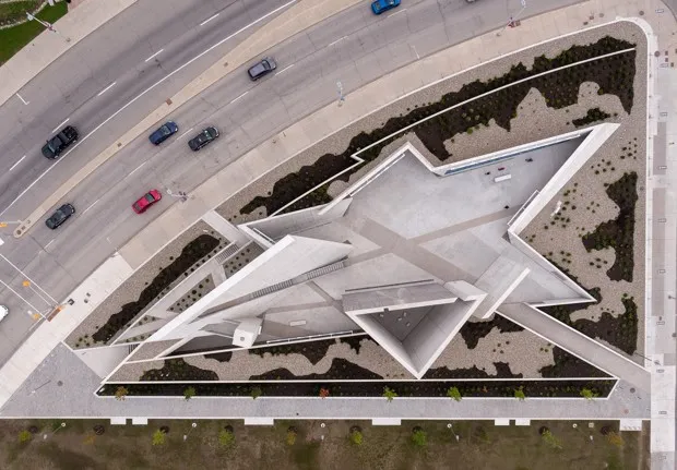 双倍空格至于它的设计,利贝斯金最终选择了六个不规则三角形的不均匀但统一的构图,从地面看似乎是随机的,但从空中看去,形成了一个压扁的大卫星。
