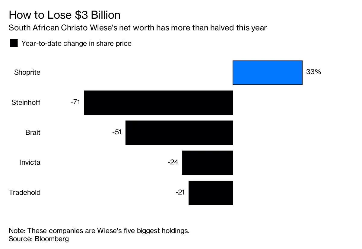 维塞在斯坦霍夫拥有19%的股份,以及在Brait和Shoprite分别拥有35%和17%的股份,仍然是一位亿万富翁,但他与瑞士钟表巨头理查蒙特董事长约翰·鲁珀特和英美黄金投资董事长尼基·奥本海默争夺南非富豪榜首位的日子可能已经结束。根据彭博亿万富翁指数,他的净资产本周几乎减半,降至22亿美元。