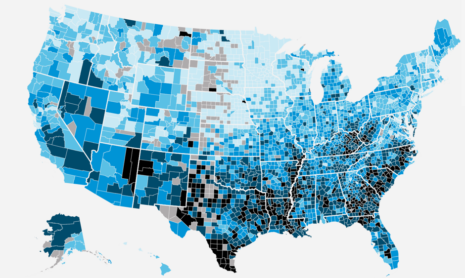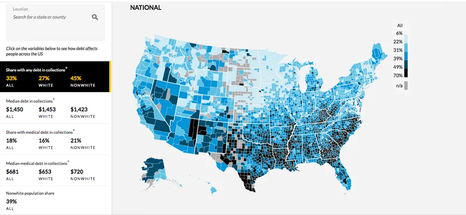 在一个新的互动地图中,城市研究所的研究人员可视化了这一巨额债务负担在地理上的差异。该地图基于来自一家主要信用局的500万条记录,显示每个县有多少家庭的债务被催收。颜色越深,未能偿还债务的人群集中度越高,包括信用卡和医疗账单、停车罚单以及子女抚养费。
