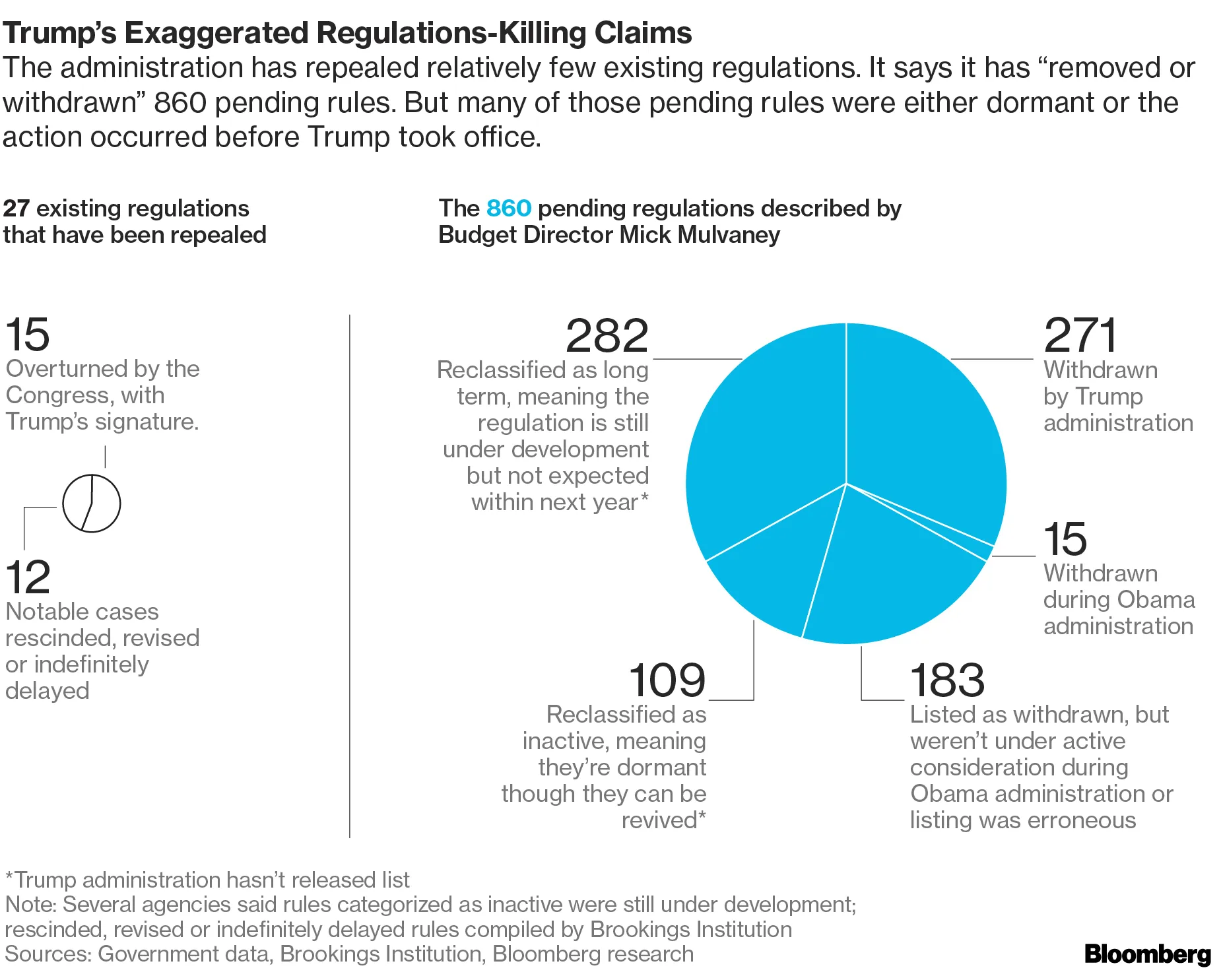 彭博社新闻的审查发现,即使这些说法也被夸大了。数百项待决法规在特朗普上任之前就已被有效搁置。其他被列为撤回的法规实际上仍在联邦机构中开发。还有更多则是无效的,因为待决规则中寻求的行动已经生效。