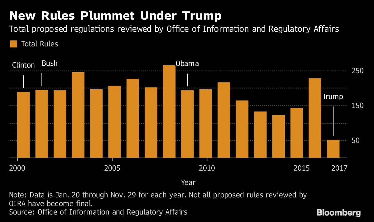 政府也显著放缓了新规的采纳。根据其记录,白宫的监管监督机构——信息和监管事务办公室,截至11月29日,仅完成了52项最终规则的审查,这些规则是从官僚机构中逐步上升的。去年同期,巴拉克·奥巴马总统的OIRA团队已完成了四倍于此数量的审查。