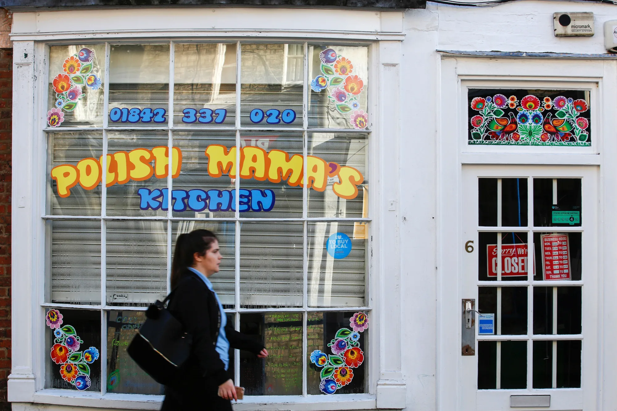 波兰妈妈的厨房出售像饺子和克罗基的美食。摄影师:卢克·麦克格雷戈/彭博社在街对面的波兰妈妈的厨房,出售饺子、波兰饺子和克罗基,波兰薄饼,老板凯亚·瓦西拉-宾厄姆情绪低落。她的十几个朋友和他们的家人已经回到波兰。