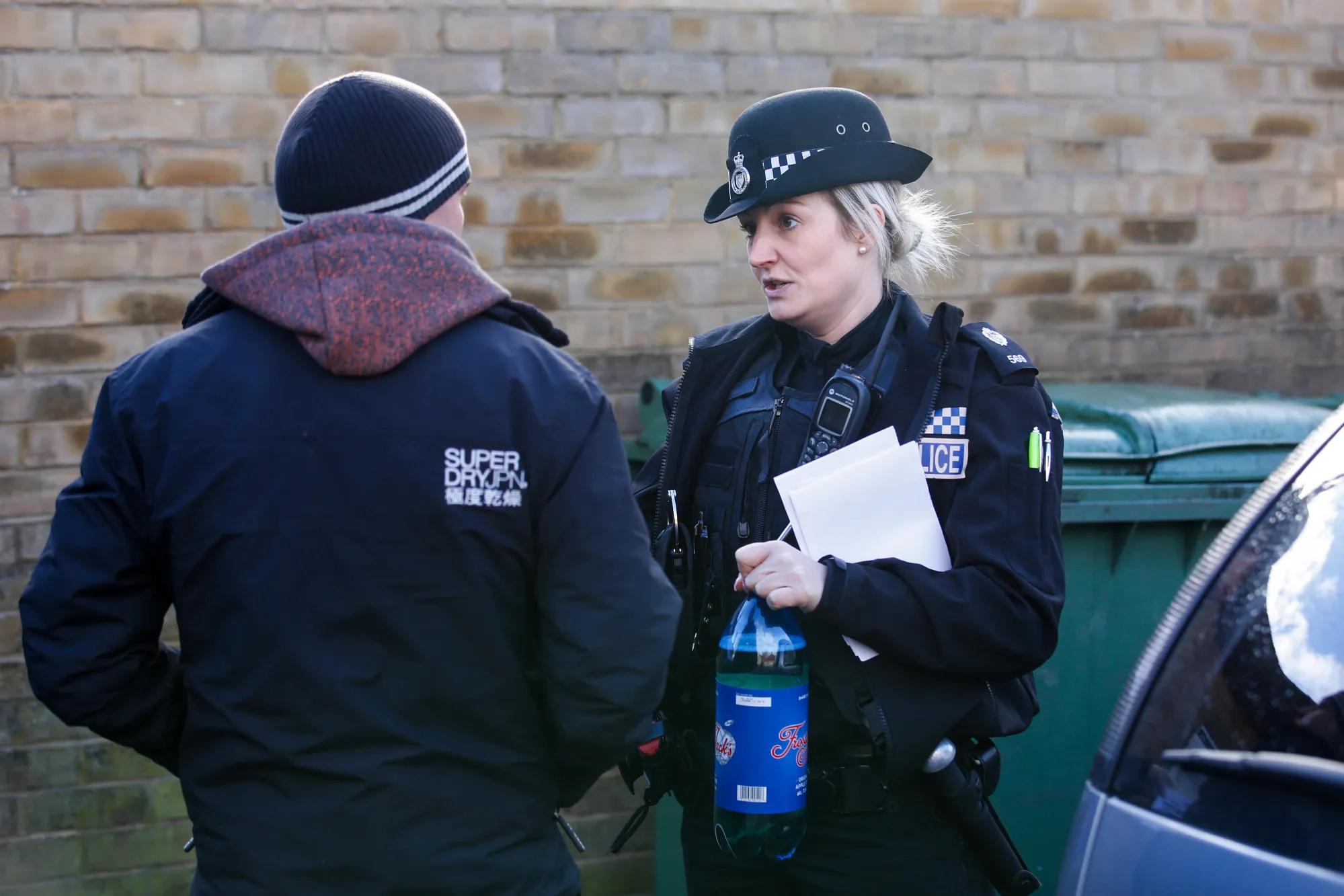 警察艾米·卢卡斯从泰特福德的一名街头饮酒者那里没收了一瓶啤酒。摄影师:卢克·麦克格雷戈/彭博社“公众的看法是所有的街头饮酒者都是东欧人,但并不是,”卢卡斯说,她在一次下午的巡逻中几乎都能叫出他们的名字。