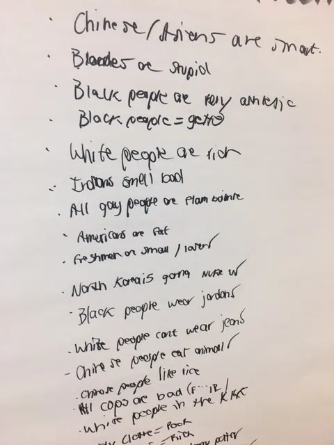 学生们在阿伦德尔高中的一次社区公民课程中列出了常见的刻板印象进行讨论。Mimi Kirk/CityLab谈话转向了孩子们自己经历的刻板印象。“人们认为我因为是黑人而是个暴徒,”一个名叫卡勒布的男孩说。“但你看起来不像暴徒!”有人喊道。“你戴着眼镜。”班级里紧张地笑了。