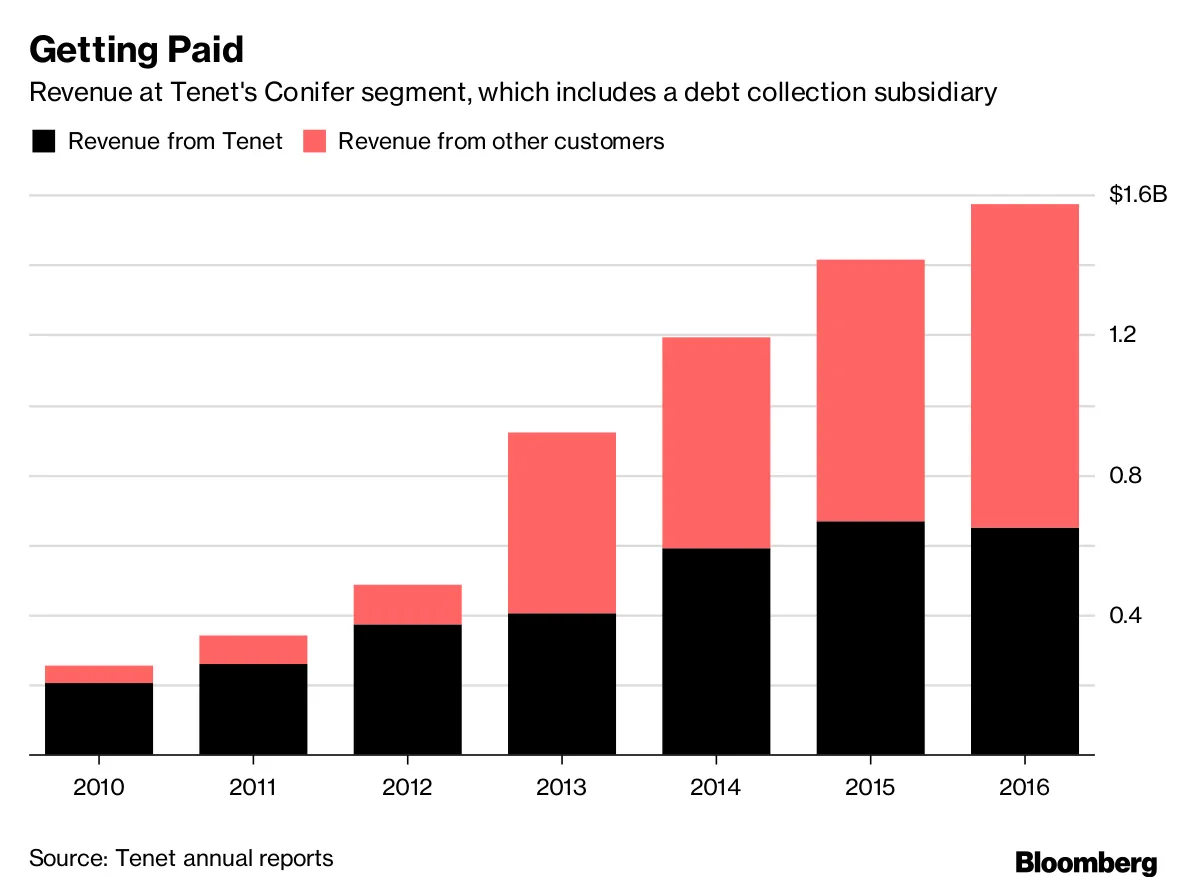 大多数医院都有财务部门或外部公司,试图确保他们能从保险公司和患者那里获得付款。但泰纳比大多数医院更进一步,将其运营转变为一个名为Conifer的独立业务线,并将其服务外包给其他医疗提供者。