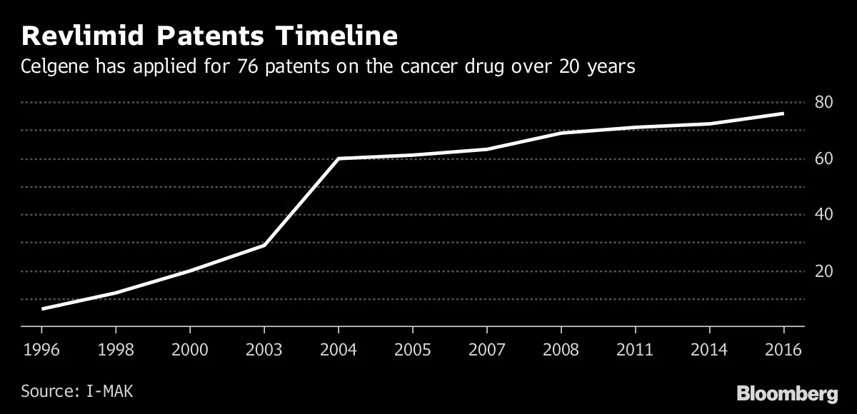 **旧药的新专利:**Celgene获得了61项关于Revlimid的专利,其中许多是在该药首次获批多年后才获得的。这可能使Celgene成为 主导制造商长达20年。