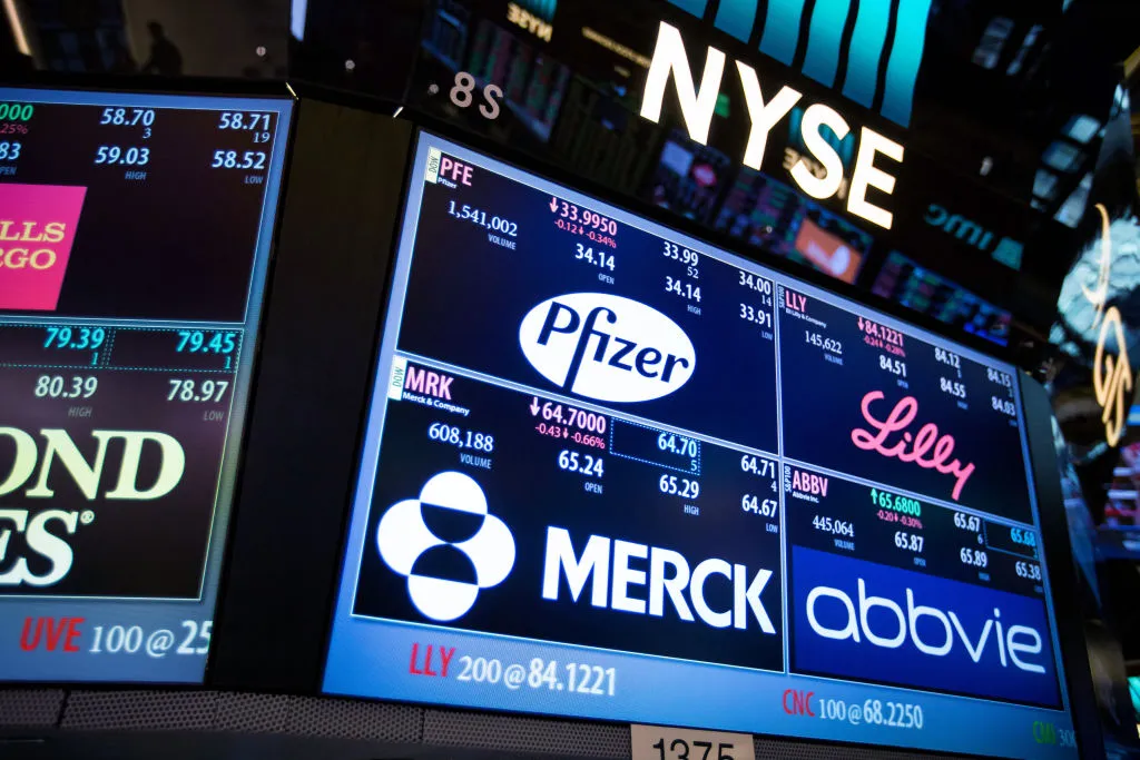 一台显示器在美国纽约证券交易所(NYSE)展示辉瑞公司、礼来公司、艾伯维公司和默克公司(Merck & Co Inc.)的标识,时间是2017年3月13日,星期一。