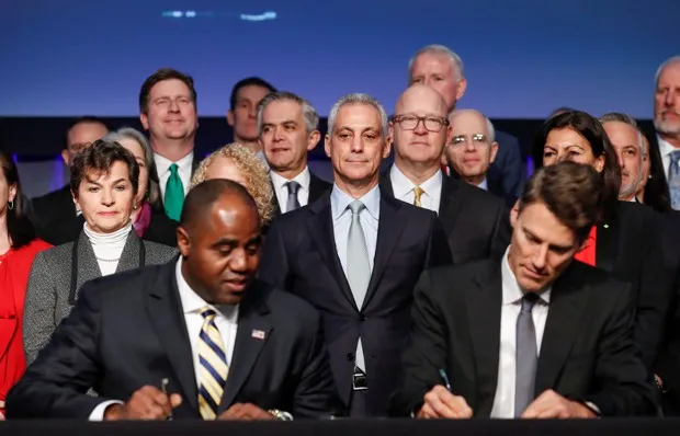 一群市长在12月签署了芝加哥气候宪章。卡米尔·克拉恰津斯基/路透社美国的城乡分歧在唐纳德·特朗普总统当选后成为不可避免的讨论点,而他执政的第一年只进一步加剧了一般持进步价值观的城市飞地与保守的内陆地区之间的对抗。看看CityLab的理查德·弗罗里达为政治家撰写的“城市独立宣言”,呼吁城市绕过反城市的白宫。