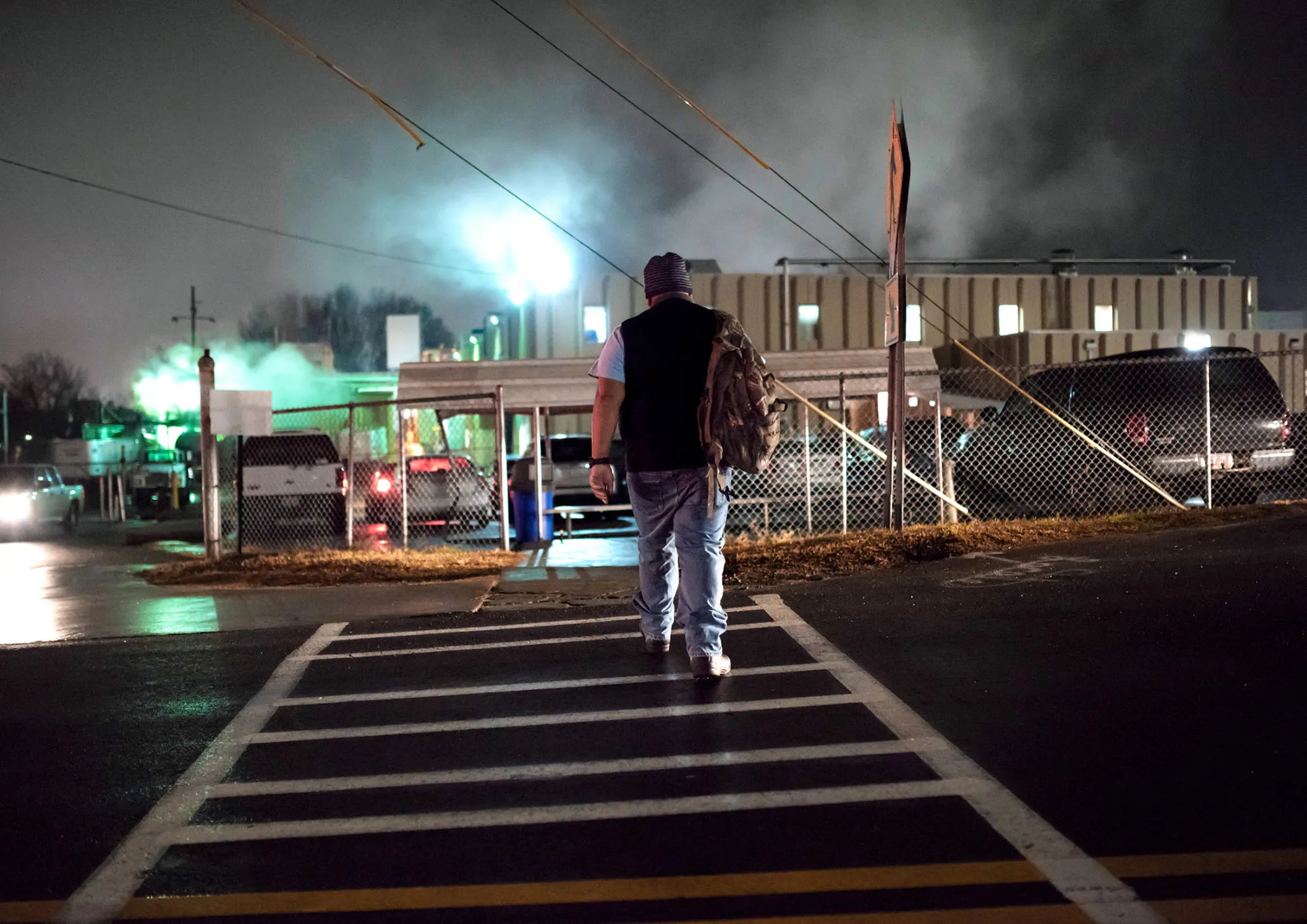 一名第三班次的工人走进位于乔治亚州盖恩斯维尔的Mar-Jac禽类公司。