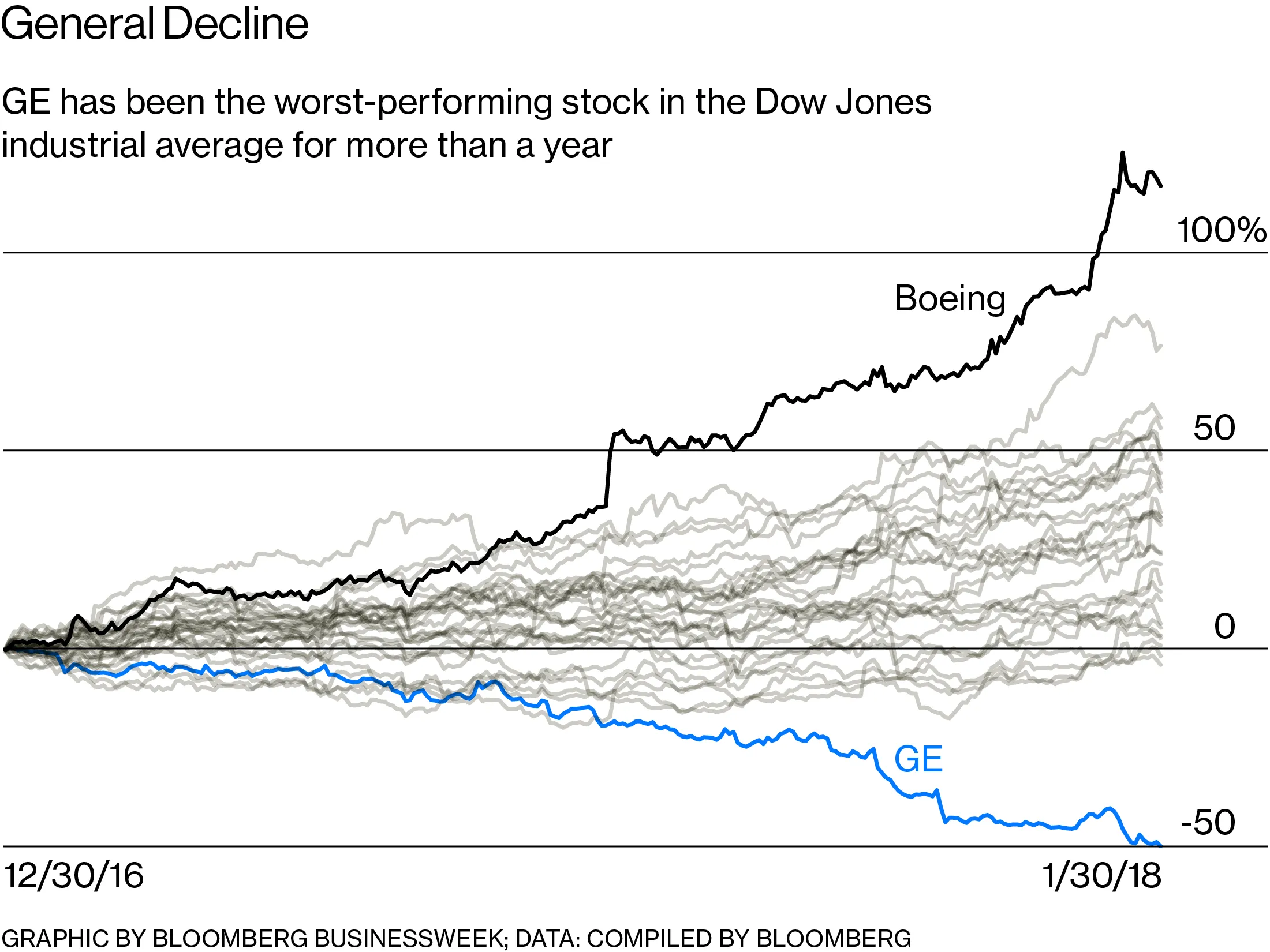 然而,过去一年,通用电气进入了新领域。自2016年11月唐纳德·特朗普当选以来,在道琼斯指数上涨41%的股市繁荣中,通用电气的价值损失了46%,即1200亿美元。在伊梅尔特去年夏天退休几个月后,该公司 震惊了华尔街,宣布的收益仅为分析师已下调预期的一半。随后,通用电气表示将削减其曾经神圣不可侵犯的股票分红,因为现金短缺。它还表示将出售或剥离200亿美元的业务,包括其灯泡部门。(家电业务在2016年被出售给中国制造商海尔集团,并获得使用通用电气品牌的许可。)