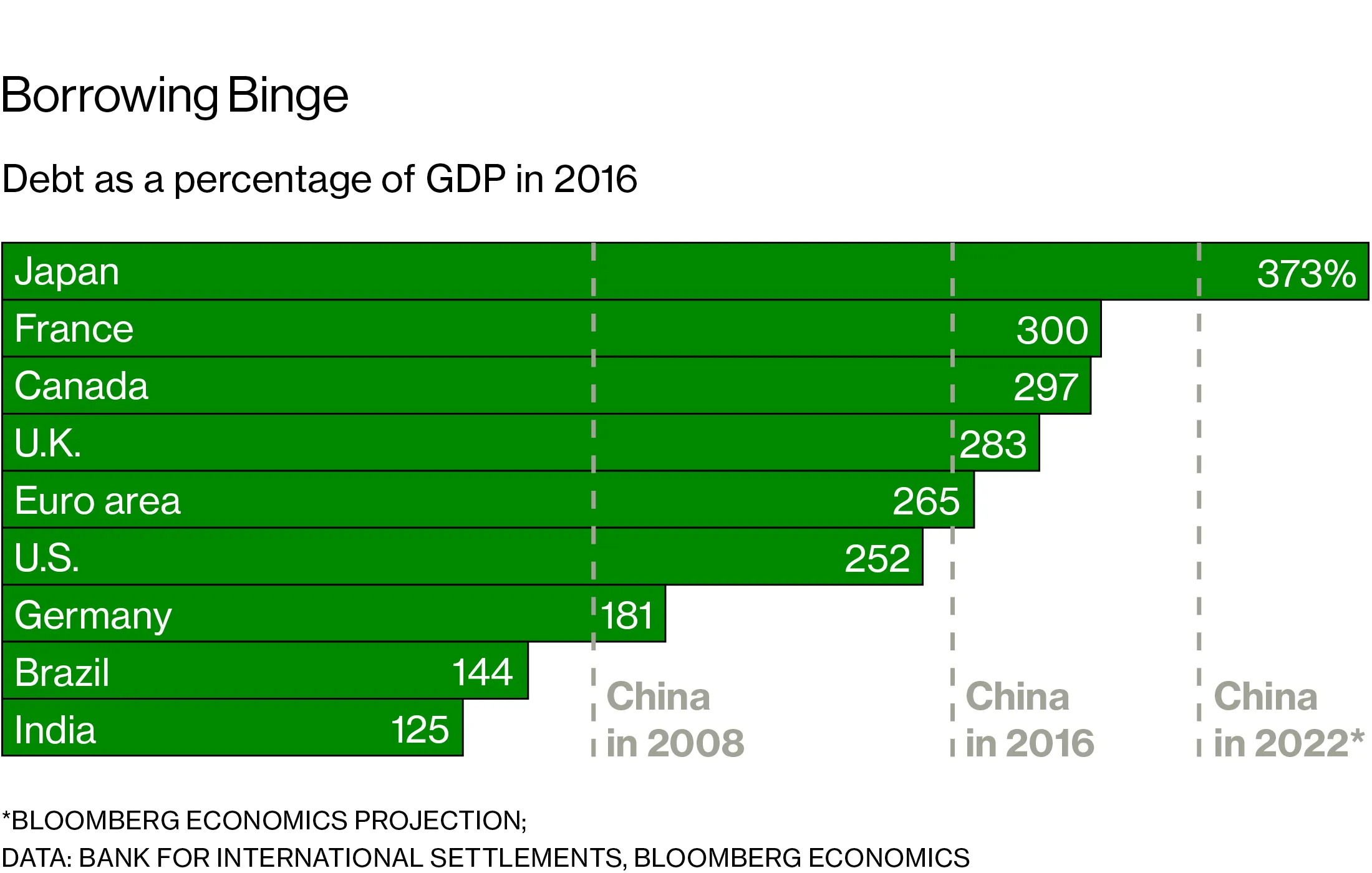 中国的总债务在2008年达到了国内生产总值的162%。到2016年,这一数字攀升至259%,增加了超过22万亿美元,主要是由于企业的大规模借贷。即使在当前去杠杆的推动下,预计到2022年,这一比例可能达到327%,根据彭博经济学的预测。