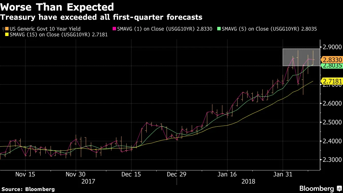 债券市场的动荡比任何人预想的都要严重。基准10年期国债收益率在周四上升至2.88%,同时其价格下跌。在彭博新闻在1月5日至1月11日之间进行的调查中,63名受访者中对本季度的最高预测为2.85%。这令人担忧,因为像亿万富翁债券经理杰弗里·冈德拉赫这样的投资者表示,几乎所有市场都在过去几年中严重受益于——甚至依赖于——低收益、低波动的范式。债券交易者最糟糕的恐惧正在同时汇聚。不仅经济在蓬勃发展,通货膨胀也开始加速。这发生在美国政府即将抛售大量债券,追求其今年至少将债务销售翻倍至超过1万亿美元的目标,以弥补减税带来的收入损失。哦,此外,美联储在到期债券的收益再投资方面也减少了市场上的资金。 共和党减税和未来两年支出协议对赤字的综合影响可能会超过奥巴马总统在2009年和2010年经济衰退最严重时期所增加的5800亿美元经济刺激,彭博新闻报道。
