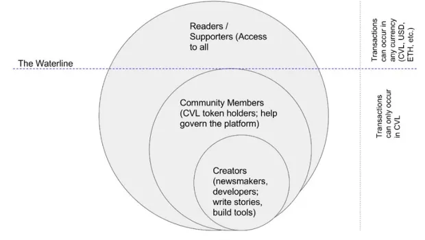 我们发现“水线”概念是一个有助于分解我们生态系统如何随着Civil的发展而形成的方式。读者和支持者,最大的群体,将仅仅访问Civil以获取和支持优质新闻。我们的核心社区——持有CVL代币并参与关键社区决策(确认或质疑新闻制造者或新闻室申请、事实核查等)的人,将存在于水线以下,并参与平台的自我治理。最后,一群“创作者”将存在于核心:社区认可的记者,创作在Civil新闻室上发布的故事,以及根据广泛生态系统需求构建新工具和体验的开发者。
