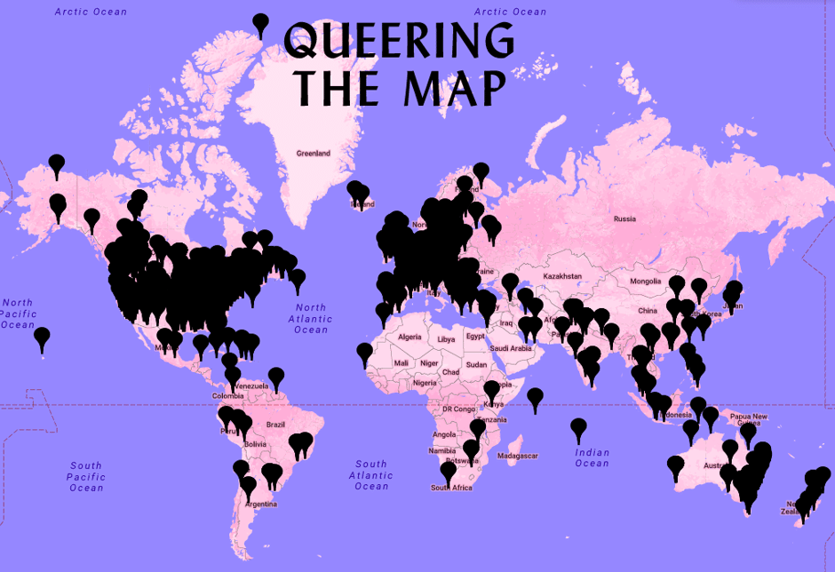 这可能是 地图的酷儿化 的故事的一部分,这是由22岁的设计师和蒙特利尔康考迪亚大学的学生Lucas LaRochelle发起的一个新的互动地图项目。匿名用户在一个粉色和紫色的全球地形上放置图钉并写下信息,定位塑造他们酷儿身份的时刻。