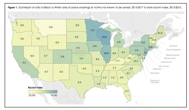 彭博社城市实验室随着乡村医院关闭产科病房,城市医院也随之而来伦敦的奥运遗产如何重塑被遗忘的东区香港的旧机场成为城市房地产痛苦的象征来自过去关于与汽车共存的响亮警告在这项研究中,由社区健康科学教授迈克尔·西格尔领导的研究小组查看了2013年至2017年间的致命警察枪击数据,这些数据来自于 警察暴力地图 数据库,然后将其与五个系统性种族主义的关键指标进行比较——种族隔离、监禁率差距、教育成就差距、经济差距指数和就业差距——针对每个州进行分析。非裔美国人在这五个方面的表现越差,相对于白人,州的“州种族主义指数”得分就越高。如果一个州在这五个因素上得分较高,并且恰好有较高的无武装非裔美国人被警察射杀的每 capita 率,那么结构性种族主义就可以作为解释这些州警察暴力的合理依据。
