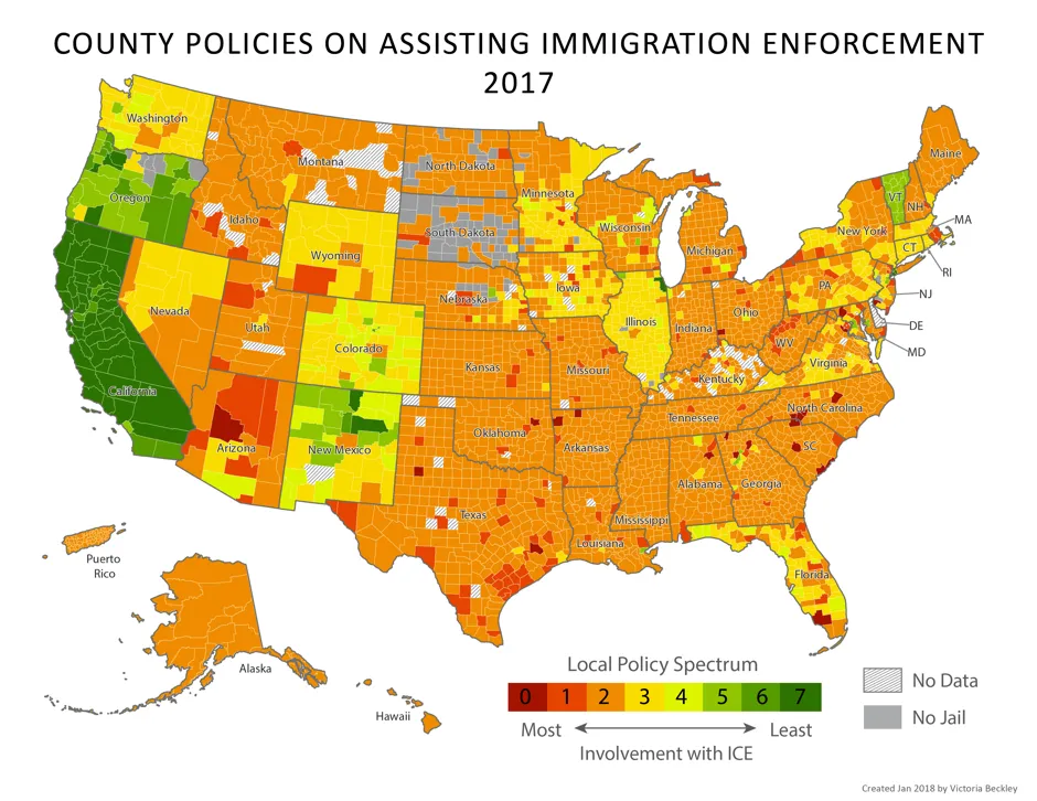 这张地图显示了哪些县在联邦移民执法中参与最少(绿色)和参与最多(红色)。移民法律资源中心ILRC法律研究人员根据一个七点评分标准创建了这些排名,该标准反映了3000多个县现有庇护政策的范围。他们包括限制使用市政资源进行移民执法的政策,禁止警察收集移民身份信息的政策,要求警察拒绝ICE无证拘留请求的政策,以及其他政策。他们还查看了这些地方是否与ICE有协议(称为287(g)协议)以授权他们的警察执行各种移民执法职责。