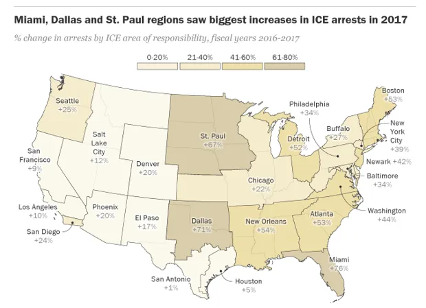Pew的报告详细分析了2017年逮捕人数按地区的增加情况,显示了ICE在哪些地方最为有效。该机构在一些主要城市设有办事处,这些办事处不仅覆盖该城市,还涵盖有时跨越多个州的更广泛的“责任区域”。所有这些区域在2017年都看到了逮捕人数的增加,但迈阿密办事处覆盖整个佛罗里达州,增幅最大——与2016年相比,增加了惊人的76%。达拉斯和圣保罗紧随其后,分别增加了71%和61%。(达拉斯的绝对逮捕人数在所有办事处中最高。) 新奥尔良、亚特兰大、波士顿和底特律的增幅均超过50%。