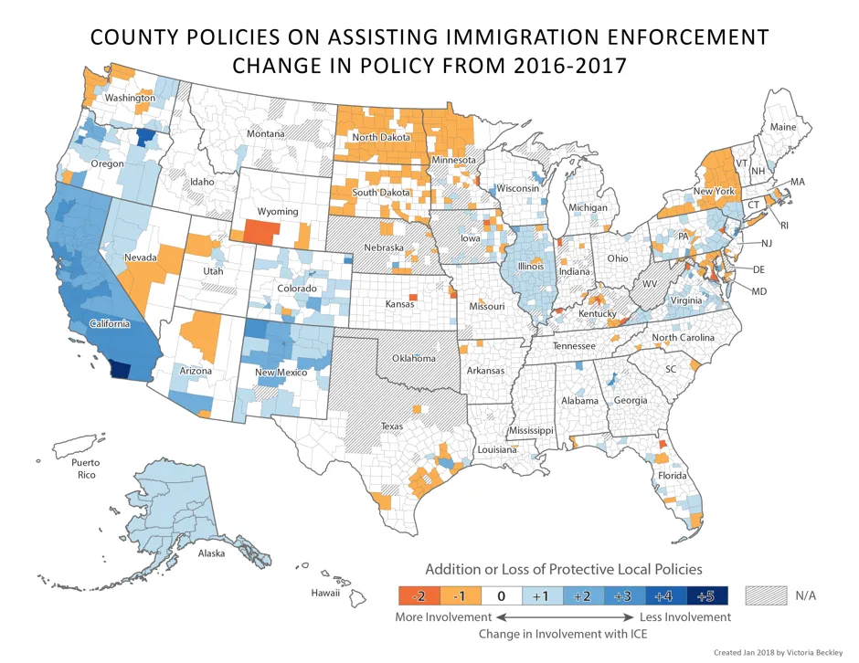 地方政治在过去一年中也因应国家移民议程而发生了变化。第二和第三张地图显示了当前县级庇护政策——以及自特朗普上任以来它们的变化。这两张地图来自移民法律资源中心(ILRC)的一份新报告,该组织一直在追踪地方在移民执法中的参与程度。