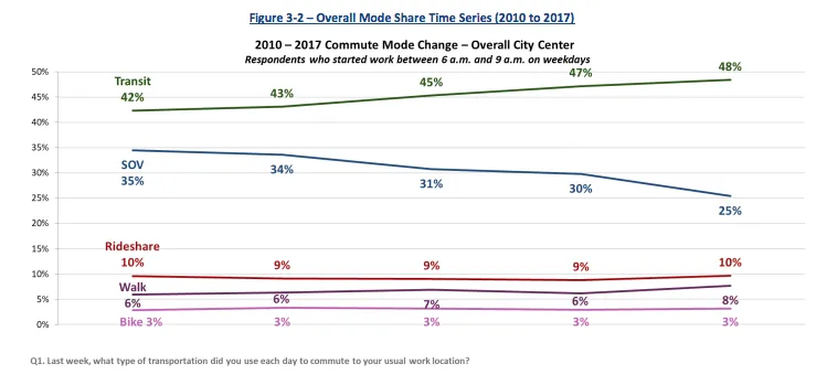 但部分得益于该地区最大雇主的巨大努力,单独驾车进入西雅图市中心的通勤者比例正在急剧下降。