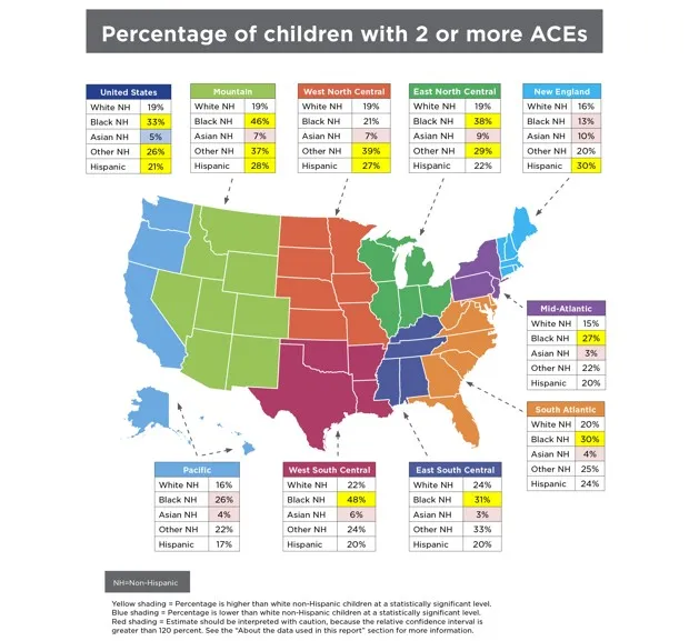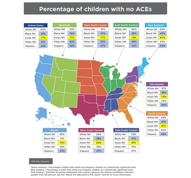 种族也是儿童经历不良童年经历的强有力指标。“在我们观察的几乎所有州组以及全国范围内,白人和亚裔儿童的不良童年经历发生率最低,而黑人和西班牙裔儿童往往最高,”萨克斯说。从数字上看,这意味着61%的黑人儿童、51%的拉丁裔儿童、40%的白人儿童和23%的亚裔儿童经历过至少一次不良经历。