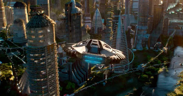 在瓦坎达首都的开场镜头中,这个虚构的非洲国家由豹形主权者/超级英雄T’Challa统治,悬浮火车沿着轨道在密集的未来主义高楼和低矮的商业走廊中穿梭,走廊中点缀着公园和森林。稍后,T’Challa和Nakia,一位精英瓦坎达间谍及其前爱人,在时尚的斯特普镇社区中相聚,电车在空中悬浮。一个广泛的货运网络用于运输振金,这种神话般的金属仅在瓦坎达发现,也连接着其巨大的矿井。