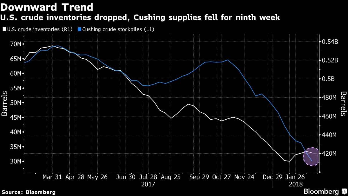 加油站即将面临痛苦准备好在油价上涨至两周来的最高点后,可能在加油站支付更高的价格。由于美国供应意外减少和出口激增,交易员纷纷入场,打消了人们对新的页岩油繁荣将使国家充斥原油的担忧,彭博新闻的杰西卡·萨默斯表示。期货在纽约上涨了最多1.9%,达到每桶62.85美元,此前政府报告显示美国库存上周减少了162万桶,这是五周以来的最大降幅,与彭博调查中估计的290万桶的增加形成对比。同时,石油输出国组织的减产正在帮助消耗全球过剩。根据油轮追踪公司Oil Movements的数据,该组织的运输量将在到3月10日的四周内减少30万桶/天。阿联酋能源部长苏海尔·阿尔·马兹鲁伊在伦敦国际石油周会议上表示,担忧的是石油供应不足,而不是过剩。