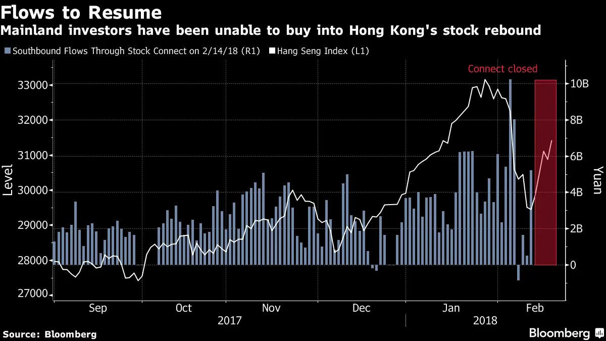 中国交易热潮MSCI新兴市场指数周四跌幅最大,接近两周,但不要怪中国。随着春节假期结束,中国大陆股市交易恢复,股市大幅上涨,追赶香港市场的涨幅,彭博新闻的Kana Nishizawa报道。CSI 300指数在上海收盘上涨2.2%,是自2016年8月以来的最大涨幅,此前大陆双重上市的股票相对于香港股票的价格降至自6月以来的最低水平,较本月早些时候的近两年高点下降。根据彭博新闻的Yinan Zhao和Miao Han的报道,中国传统的春节消费热潮延续到了狗年。根据商务部的数据,春节假期期间(2月15日至21日),餐厅和购物中心的销售额同比增长10.2%,达到约9260亿元人民币(1460亿美元),相比去年春节周。家用电器如扫地机器人特别受欢迎。