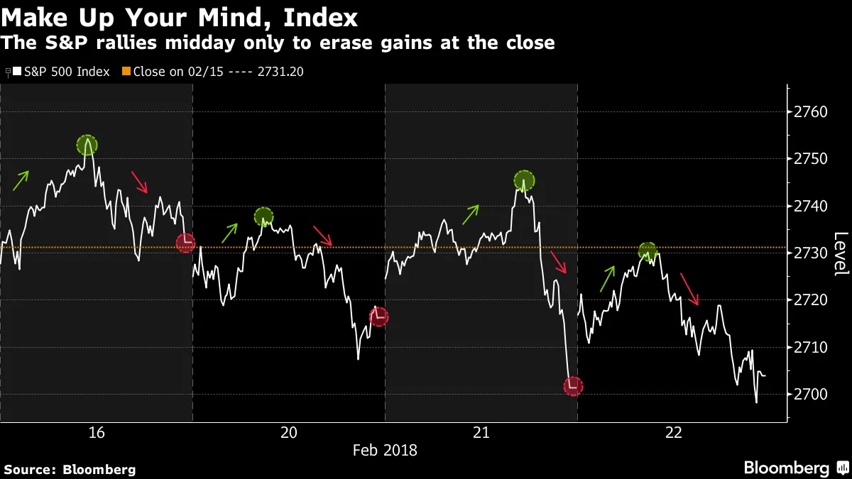 即使在最近几个月收益率上升的情况下,越来越多的债券交易商建议客户谨慎接近市场。在周四的七年期国债拍卖之前,摩根大通的策略师在一份研究报告中写道,“该到期债券的估值看起来很高”。花旗集团的策略师表示,他们变得更加看空,将国债头寸降低到“中性”,原因是供应动态恶化、实际利率仍然低迷,以及如果10年期国债收益率突破3%可能会出现的“范式转变”。股票进入令人担忧的模式在一个正在变成令人担忧的趋势中,标准普尔500指数在早盘交易中飙升,随后在当天晚些时候失去了大部分或全部涨幅。该基准在周四上涨了最多1.11%,但最终收盘时几乎没有变化,上涨0.1%。根据彭博新闻的埃琳娜·波皮娜和萨拉·庞泽克的说法,该基准似乎在约2750的技术阻力位上跌倒。“市场需要弄清楚接下来想要走哪条路,考虑到标准普尔在过去几天的表现,它几乎没有线索,”纽布里奇证券的市场策略师唐纳德·塞尔金告诉彭博新闻。至少股票策略师们保持信心,因为在本月所有动荡中,没有一个年终预测发生变化,庞泽克报道。事实上,根据彭博汇编的数据,标准普尔500指数年末的平均预测上升至2940,因为富国银行的股票策略负责人克里斯·哈维提高了他的预测。“说起来几乎听起来无聊,但基本面没有恶化,表明没有太大变化,”奥本海默的首席投资策略师约翰·斯托尔茨夫告诉彭博新闻,他将年末预测保持在3000。