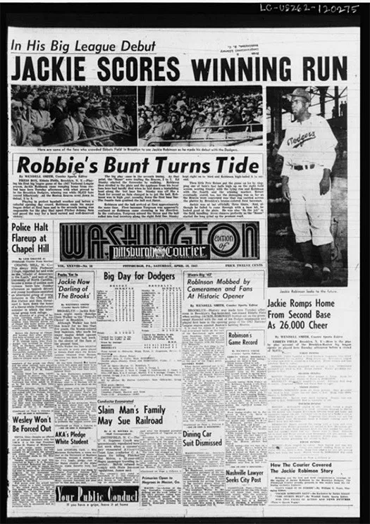 1947年4月19日《匹兹堡快递》的华盛顿版,杰基·罗宾逊在美国职业棒球大联盟打破种族隔离线几天后。快递专栏作家温德尔·史密斯将罗宾逊介绍给道奇队的布兰奇·里基。国会图书馆范恩以雇佣年轻大学毕业生为荣,他的招募者在当时一些最大的文化故事中发挥了重要作用。切斯特·华盛顿,一位匹兹堡本地人,范恩帮助他进入弗吉尼亚联合大学,他利用与拳击手乔·路易斯的幕后关系,将“棕色轰炸机”塑造成黑人心目中的英雄和白人心目中的同情冠军。体育专栏作家温德尔·史密斯,韦恩州立大学的校友,为职业棒球的融合而奋斗,随后将布鲁克林道奇队的总裁布兰奇·里基介绍给一位名叫杰基·罗宾逊的有前途的黑人联盟新秀。