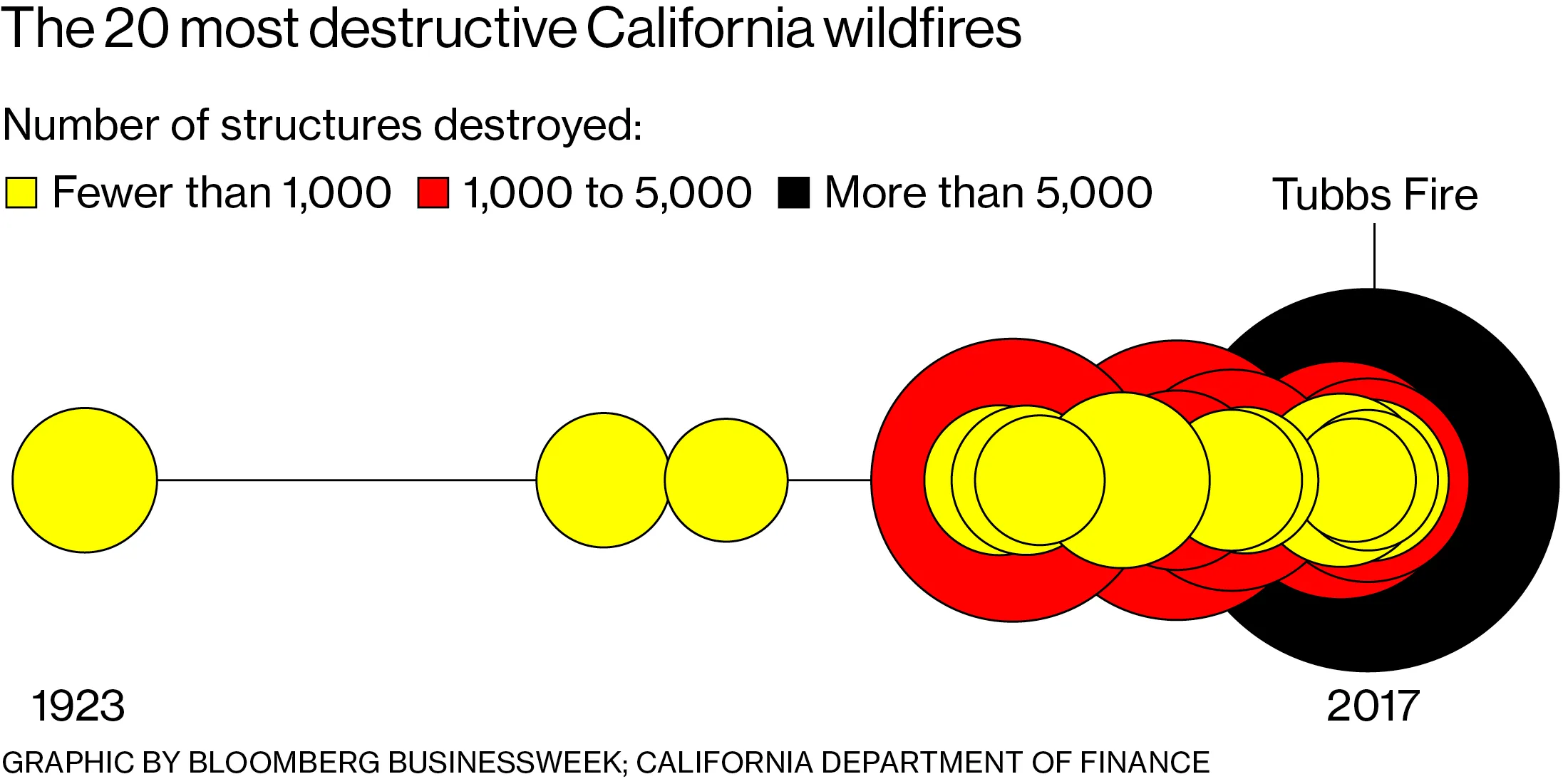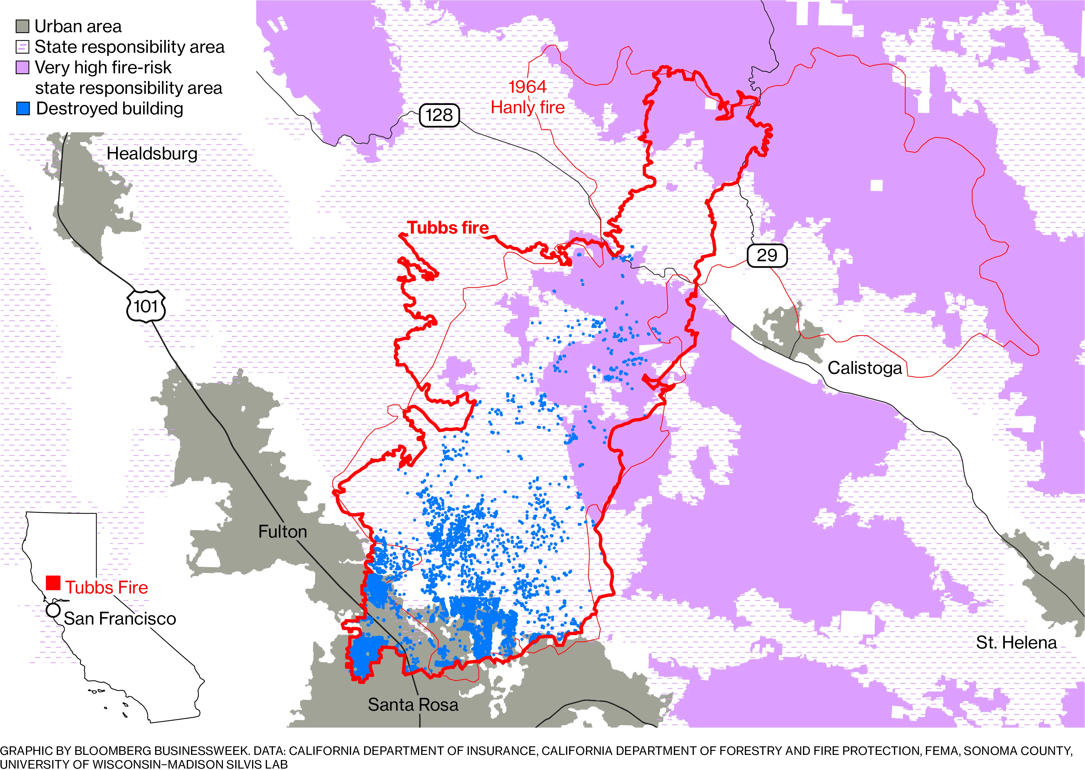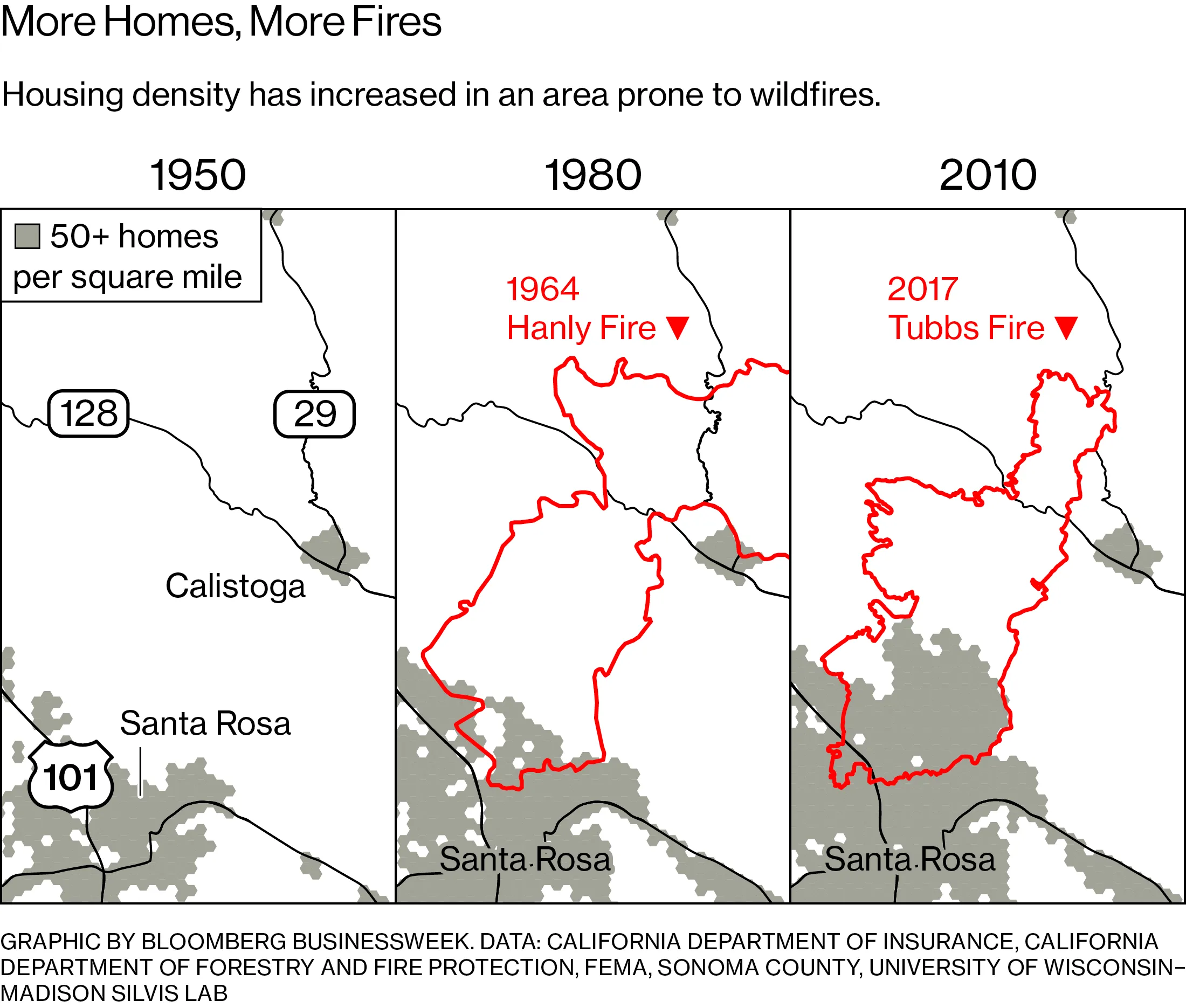 建筑热潮大大增加了火灾造成的潜在损失。1964年,索诺玛县的汉利火灾摧毁了不到100栋房屋。去年秋天,图布斯火灾几乎覆盖了相同的区域,摧毁了超过5000栋房屋,造成22人死亡。尽管它是最具破坏性的火灾,但图布斯火灾只是去年十月加州131场火灾中的一场。到年底,超过100万英亩的土地被烧毁,10000栋建筑被摧毁。