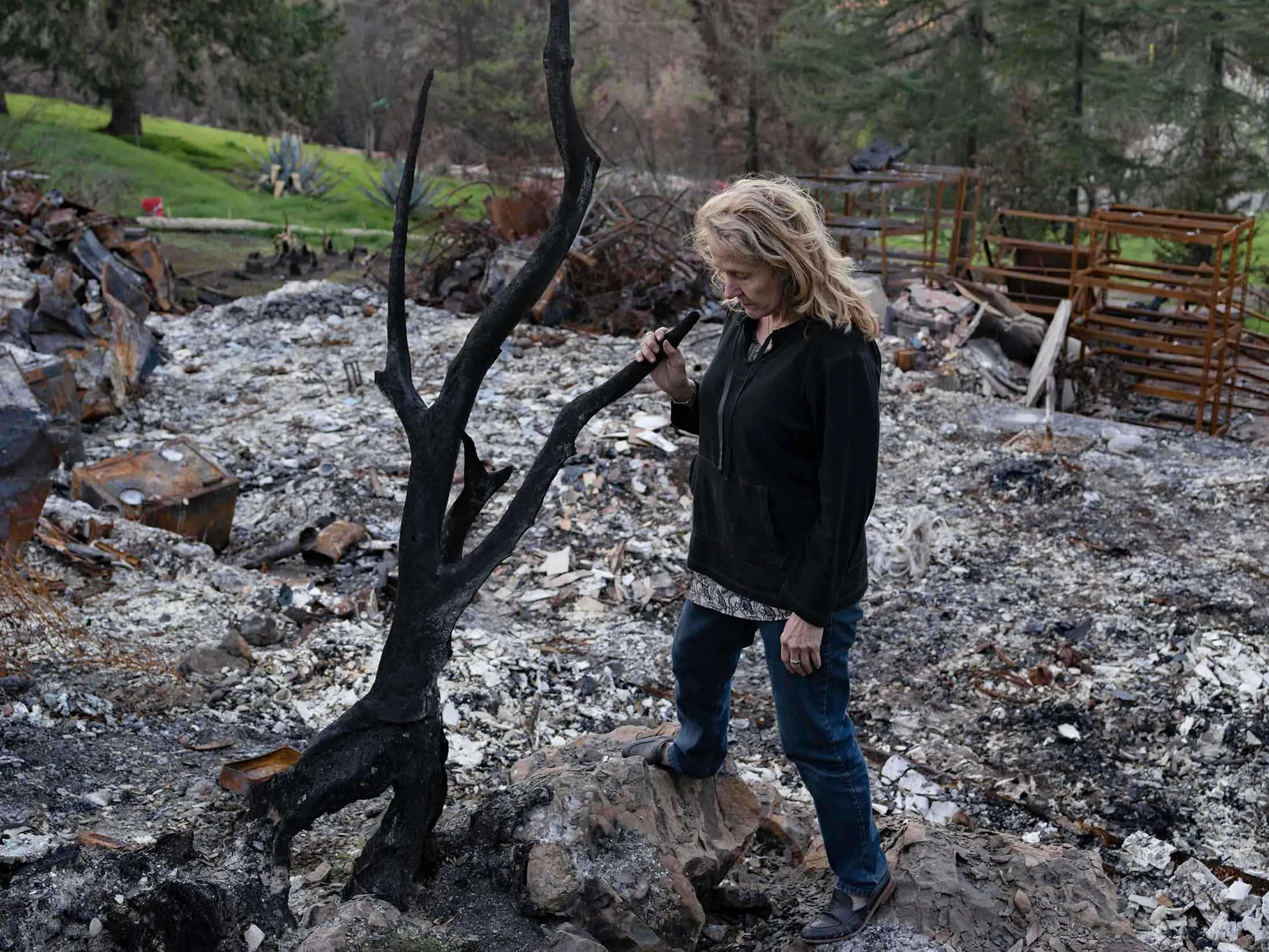 回到索诺玛,退休警察凯特·杰尼斯特在她四年前购买的房屋废墟中徘徊。她说,十月份的火灾是她经历过的第三次火灾,也是最严重的一次。她回忆起火焰包围着她的汽车,听到丙烷罐每隔几秒钟就爆炸,甚至看到动物着火。在某个时刻,她确信自己会死。“我有点和我的屁股告别了。”
