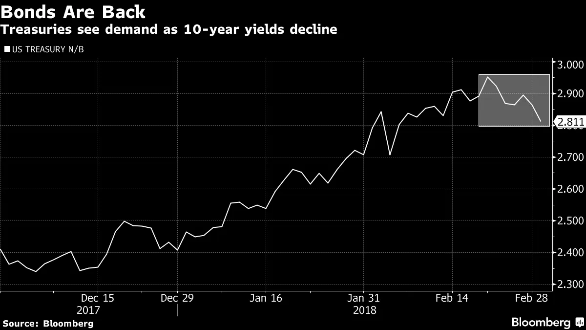 根据彭博新闻的谢莉·哈根报道,联邦储备主席杰罗姆·鲍威尔和他的高级助手赞扬了没有贸易限制的全球经济的好处。在周四对参议院银行委员会的提问中,鲍威尔表示,商品和服务自由流动的体系对许多国家来说是净积极的,尽管好处并不均等。纽约联邦储备银行行长威廉·达德利在巴西的一次演讲中更明确地表示,“保护主义不是解决方案。”全球汽车制造商表示,乔治·W·布什总统2002年的钢铁关税使经济损失了20万个工作岗位,彭博新闻的杰米·巴特斯和基思·诺顿报道。债券交易员忽视通货膨胀至少在一天内,债券交易员对更快的通货膨胀和更高的利率的前景关注较少,而更多关注贸易战可能造成的经济损害。随着股票下跌,周四对国债的需求稳步上升,两年期国债收益率降幅超过三周以来最大,尽管早前发布的经济数据揭示了更多增长的顺风,而鲍威尔在本周第二轮国会作证中重申,中央银行将继续逐步提高利率。如果你没有买入,不用担心错过反弹。国债仍然相对便宜。例如,通过购买一个月的国债,你可以获得更好的利率——1.48%——借给美国政府的利率比借给德国和日本政府30年的利率要高。然而,问题是外国政府对关税的任何报复是否会包括对美国债务的抵制。外国投资者拥有大约一半的美国国债,约6.3万亿美元。因此,美国依赖他们的购买来资助预算赤字,而预算赤字预计将因减税带来的收入损失而膨胀。