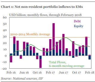 新兴市场资金流转为负自2016年11月以来,投资者就一直在回避新兴市场。国际金融协会周四表示,2月份流入新兴市场的非居民投资组合净流量下降了45亿美元,结束了14个月的净流入。此次逆转是由于股票流出58亿美元,部分被债券小幅流入13亿美元所抵消,该组织在一份报告中表示。流入的下降并不一定意味着投资者可能在押注新兴市场将面临艰难时期,而只是代表在1月份向发展中经济体的金融资产注入了490亿美元后的一点疲惫。“2月份的动荡突显了我们对新兴市场净资本流动前景的谨慎态度,”国际金融协会在报告中表示。它仍然预计其追踪的17个关键市场的净流入将在2018年超过1070亿美元,高于2017年的620亿美元。根据国际金融协会的数据,上个月的大部分流出集中在亚洲,特别是中国。土耳其、印度、阿根廷、巴西和墨西哥都出现了净流入,范围从37亿美元到150亿美元不等。