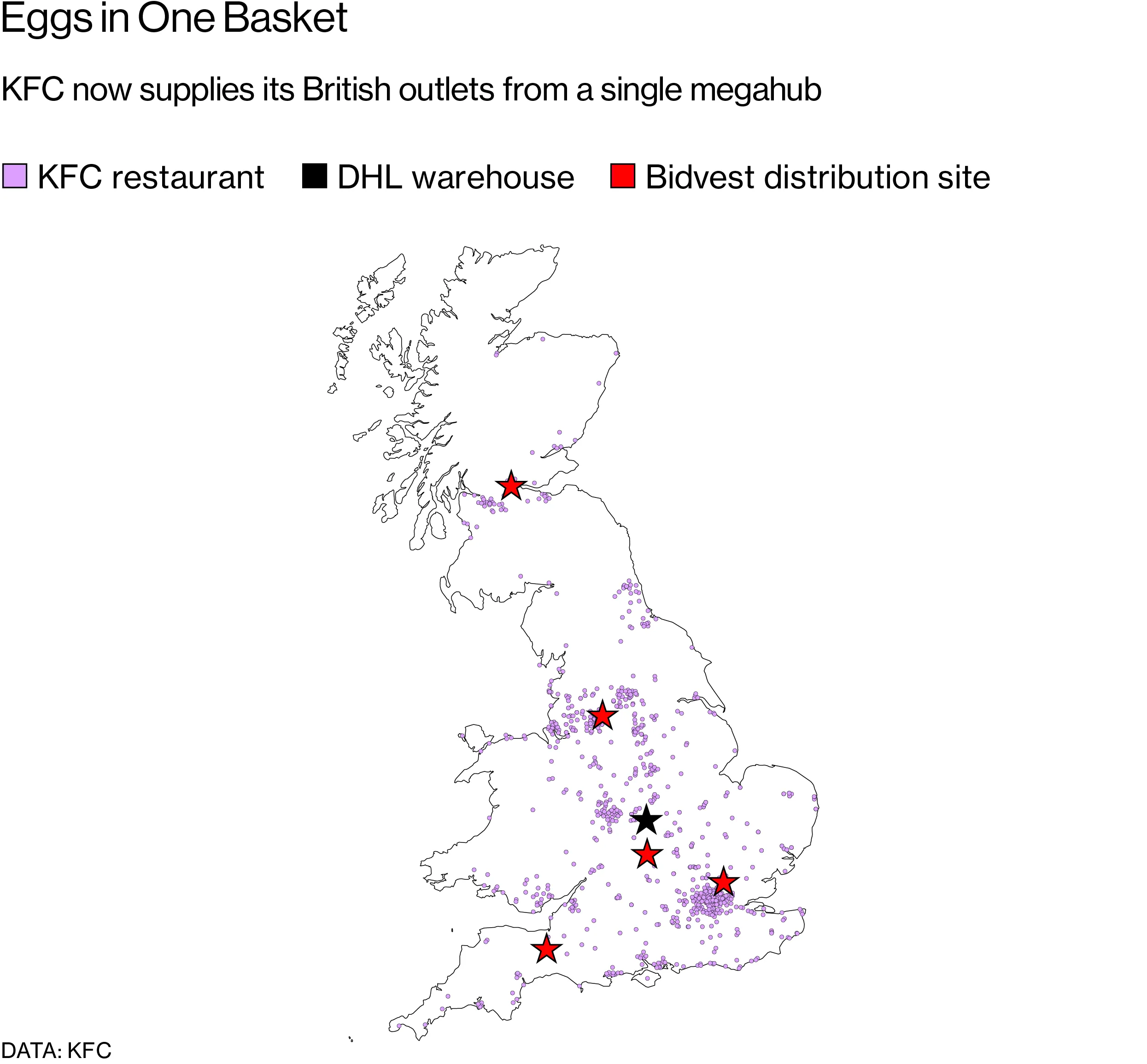 KFC 在英国的餐厅大部分鸡肉来自两个大型供应商。其中一个是 2 Sisters Food Group,由被称为 鸡肉之王 的企业家 Ranjit Singh Boparan 所拥有。根据其 网站 的信息,该公司生产英国三分之一的禽类产品,每周处理 600 万只鸟。另一个供应商 Moy Park 总部位于北爱尔兰,并在英国各地设有加工厂。它与超过 800 家禽类农场合作,包括独立农场。