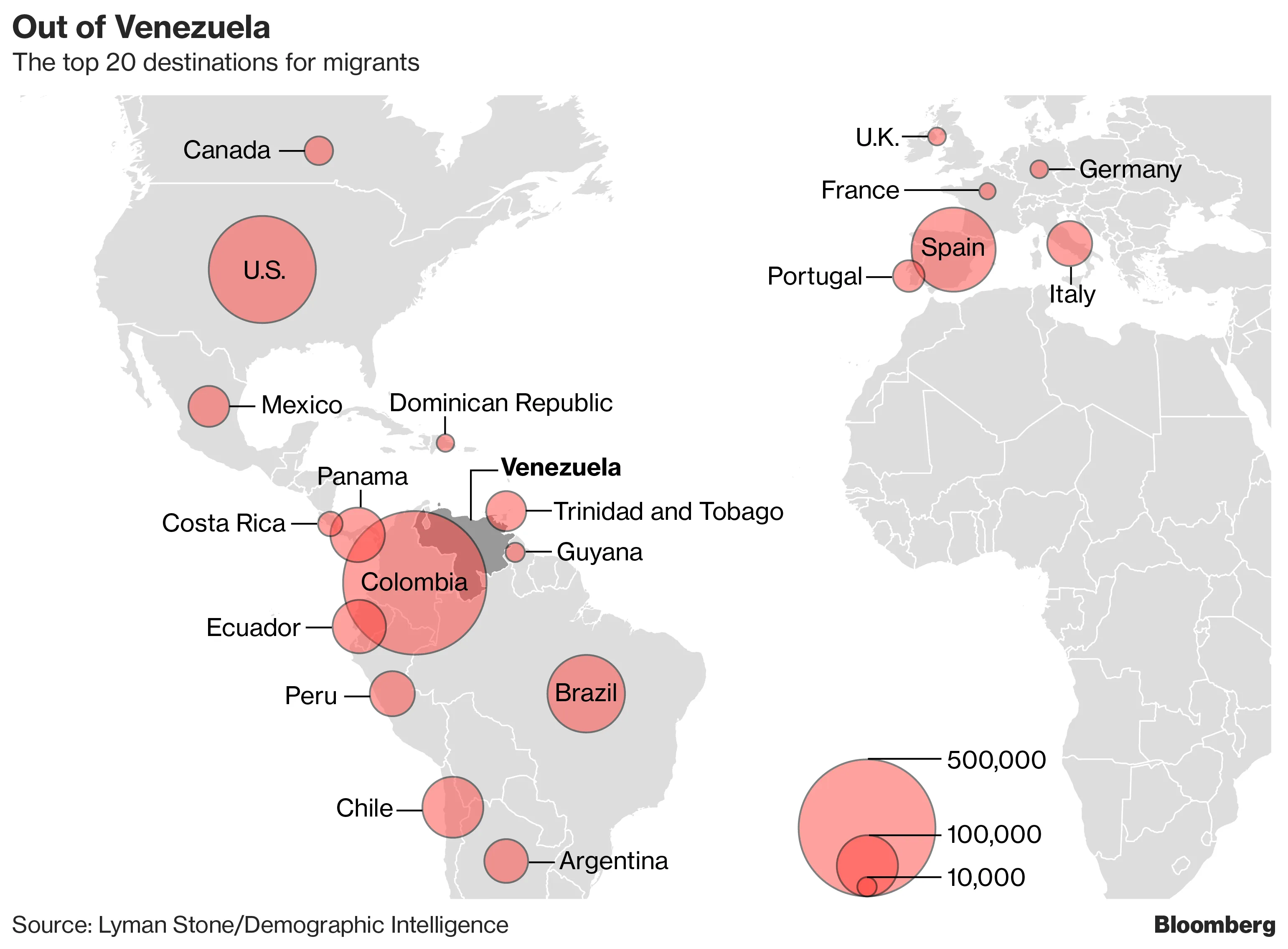 仅在哥伦比亚就有大约50万人,他们以每月约10万人的速度涌入。总统胡安·曼努埃尔·桑托斯表示,这一涌入可能是他国家最严重的问题。他收紧了签证规定,并派遣军队巡逻非正式边境口岸。保守派总统候选人亚历杭德罗·奥尔多涅斯试图借此机会,称许多委内瑞拉人参与“犯罪结构”,并呼吁政府保护哥伦比亚工人的就业。