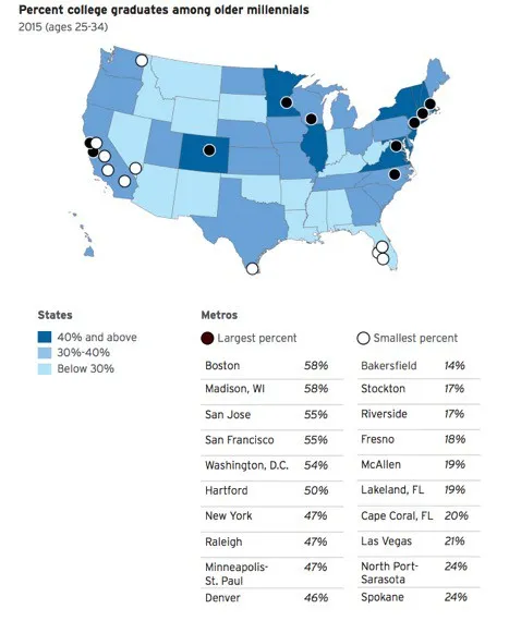 但在弗雷的数据中有一些惊喜。明尼阿波利斯-圣保罗和丹佛的千禧一代人才比例高于西雅图和奥斯丁。受过教育的千禧一代在匹兹堡、费城、巴尔的摩、纳什维尔、哥伦布、堪萨斯城和密尔沃基占千禧一代人口的40%或更多。相反,圣安东尼奥、阿尔伯克基、博伊西、俄克拉荷马城、凤凰城和科罗拉多斯普林斯的比例均低于30%。迈阿密和休斯顿的受教育千禧一代比例低于底特律和宾夕法尼亚州的阿伦敦。