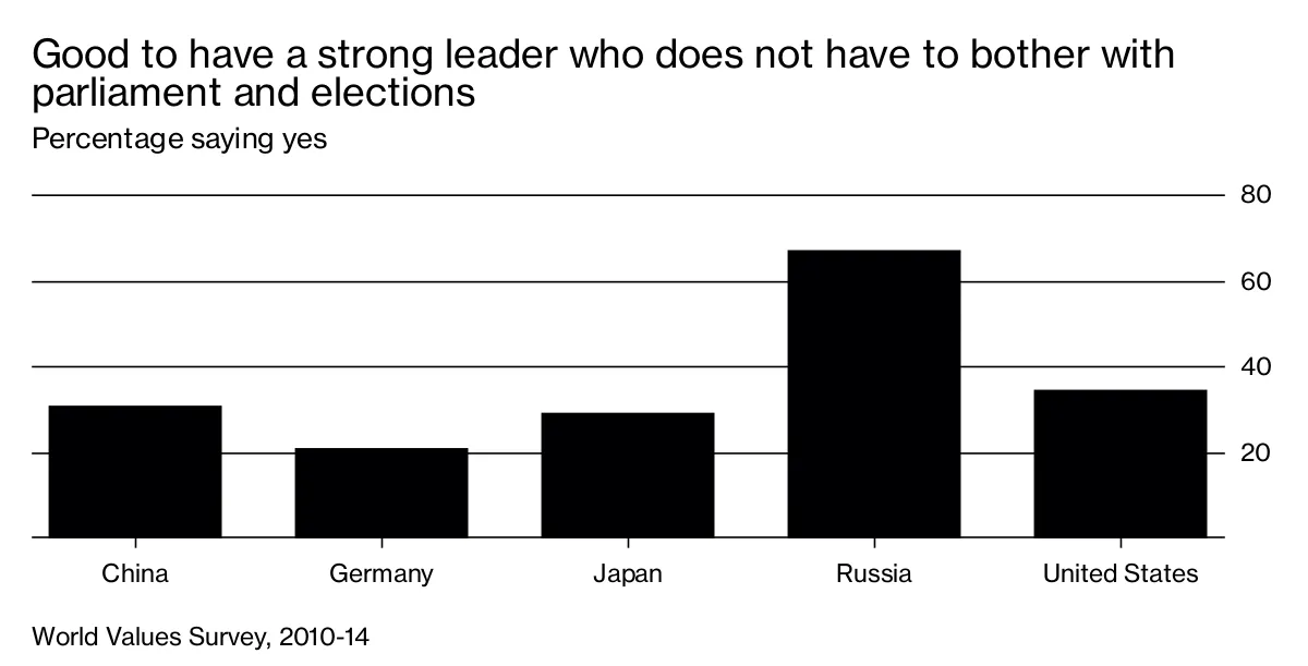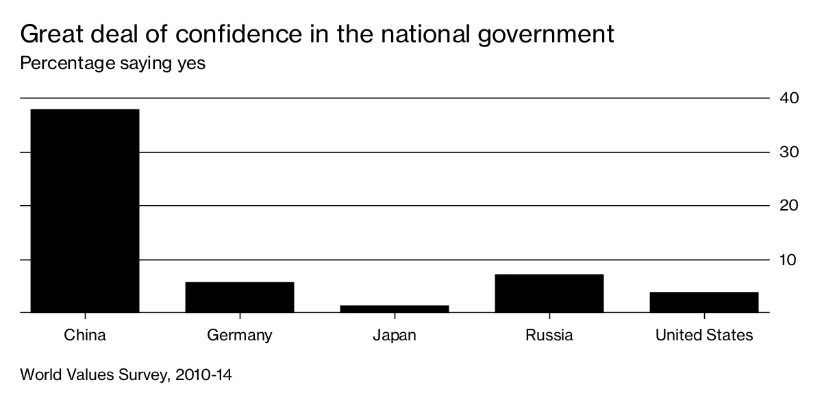 彭博社商业周刊机器人出租车的裁决已出——华尔街正在乘坐火车杰米·戴蒙担任财政部长:这个想法从未消失贾伦·布伦森是NBA现在需要的球员关于设定体育赌博赔率的公司内幕第一张图表非常引人注目。它与在民主国家普遍持有的信念相矛盾,即习近平通过武力和恐惧统治。毫无疑问,中国确实利用审查和监禁来压制异议,但图表清楚表明,大多数中国人对政府的领导充满信心。当然,人们可能为了避免麻烦而对调查员撒谎。但那么,如何解释在另一个由独裁者统治的国家俄罗斯所表现出的低信心呢?
